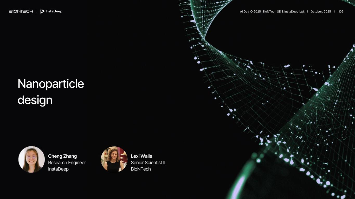 Nanoparticle design Lexi Walls Senior Scientist II BioNTech Cheng Zhang Research Engineer InstaDeep AI Day © 2025 BioNTech SE & InstaDeep Ltd. I October, 2025 I 109