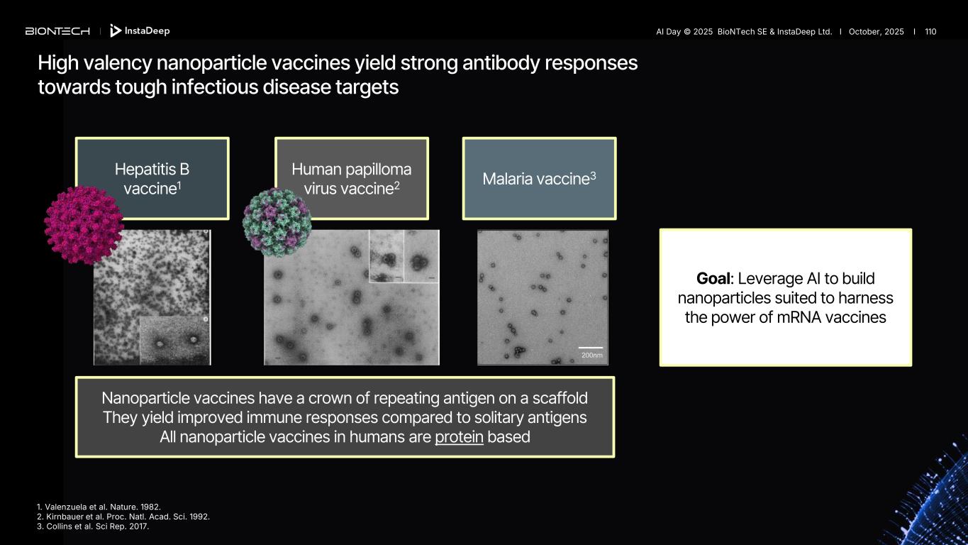 High valency nanoparticle vaccines yield strong antibody responses towards tough infectious disease targets Hepatitis B vaccine1 Human papilloma virus vaccine2 Malaria vaccine3 Goal: Leverage AI to build nanoparticles suited to harness the power of mRNA vaccines Nanoparticle vaccines have a crown of repeating antigen on a scaffold They yield improved immune responses compared to solitary antigens All nanoparticle vaccines in humans are protein based 1. Valenzuela et al. Nature. 1982. 2. Kirnbauer et al. Proc. Natl. Acad. Sci. 1992. 3. Collins et al. Sci Rep. 2017. AI Day © 2025 BioNTech SE & InstaDeep Ltd. I October, 2025 I 110