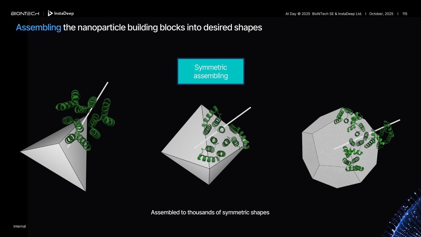 Symmetric assembling Assembling the nanoparticle building blocks into desired shapes Assembled to thousands of symmetric shapes Internal AI Day © 2025 BioNTech SE & InstaDeep Ltd. I October, 2025 I 115