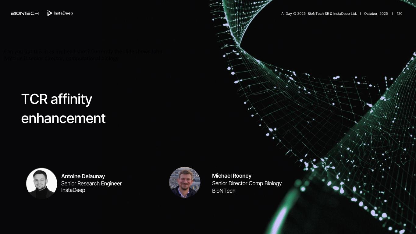 TCR affinity enhancement Antoine Delaunay Senior Research Engineer InstaDeep Michael Rooney Senior Director Comp Biology BioNTech Can you put this in as my head shot? Currently the slide shows John. MY title is senior director, computational biology AI Day © 2025 BioNTech SE & InstaDeep Ltd. I October, 2025 I 120