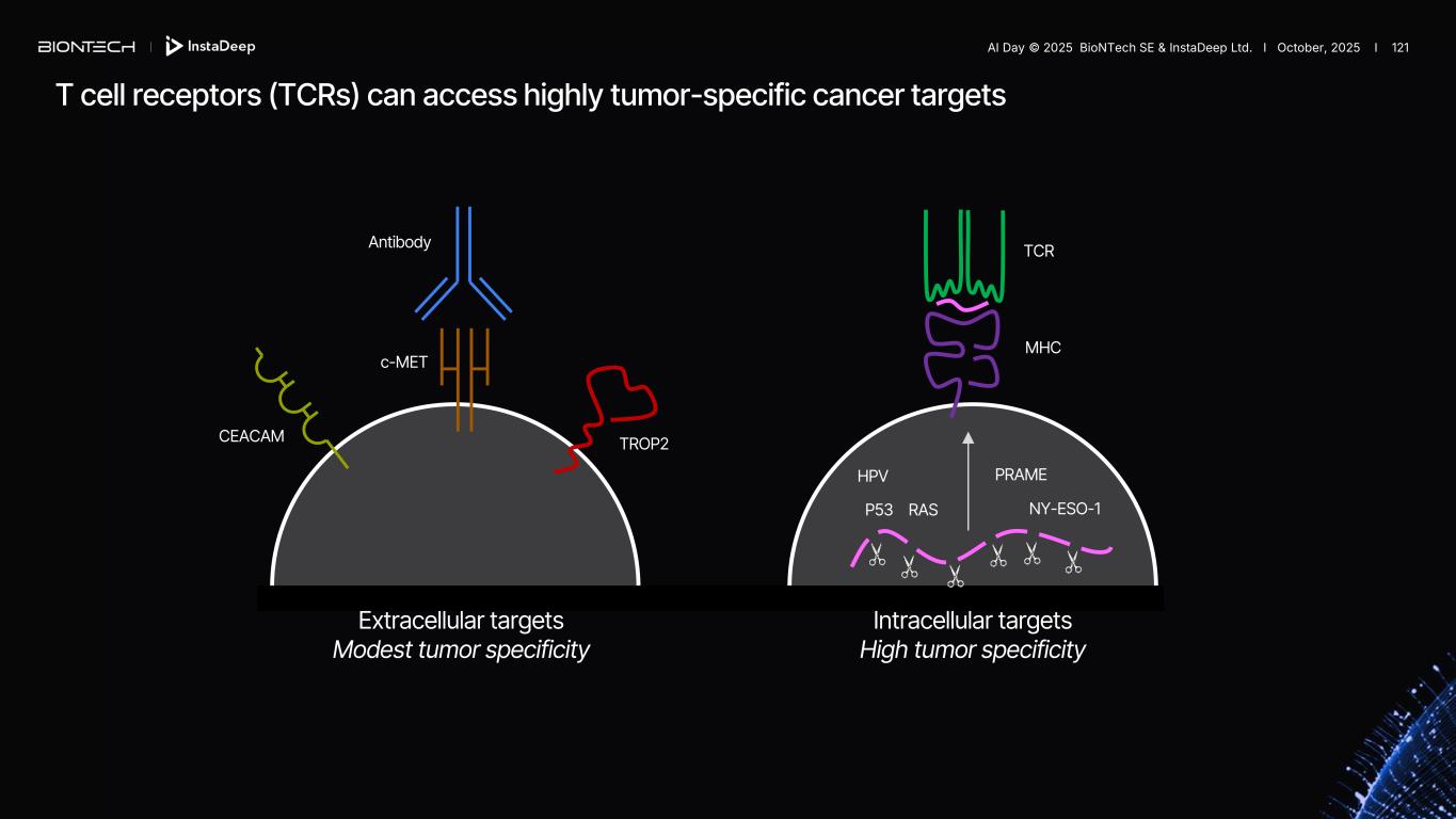 T cell receptors (TCRs) can access highly tumor-specific cancer targets Extracellular targets Modest tumor specificity Intracellular targets High tumor specificity HPV P53 RAS PRAME NY-ESO-1 TROP2CEACAM c-MET MHC TCRAntibody AI Day © 2025 BioNTech SE & InstaDeep Ltd. I October, 2025 I 121
