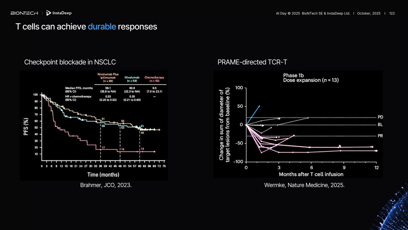 T cells can achieve durable responses Checkpoint blockade in NSCLC Brahmer, JCO, 2023. PRAME-directed TCR-T Wermke, Nature Medicine, 2025. AI Day © 2025 BioNTech SE & InstaDeep Ltd. I October, 2025 I 122