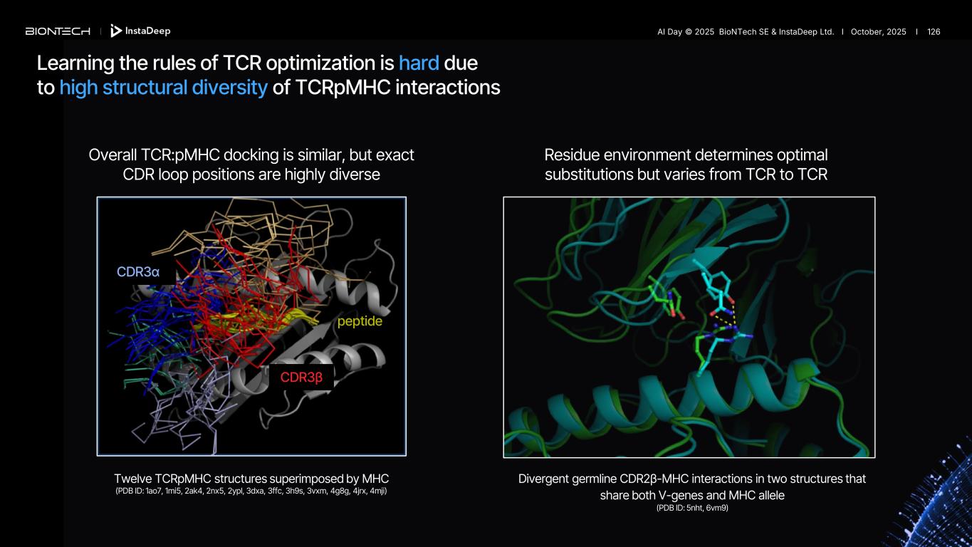 Residue environment determines optimal substitutions but varies from TCR to TCR Overall TCR:pMHC docking is similar, but exact CDR loop positions are highly diverse Divergent germline CDR2β-MHC interactions in two structures that share both V-genes and MHC allele (PDB ID: 5nht, 6vm9) Twelve TCRpMHC structures superimposed by MHC (PDB ID: 1ao7, 1mi5, 2ak4, 2nx5, 2ypl, 3dxa, 3ffc, 3h9s, 3vxm, 4g8g, 4jrx, 4mji) peptide CDR3β CDR3α Learning the rules of TCR optimization is hard due to high structural diversity of TCRpMHC interactions AI Day © 2025 BioNTech SE & InstaDeep Ltd. I October, 2025 I 126