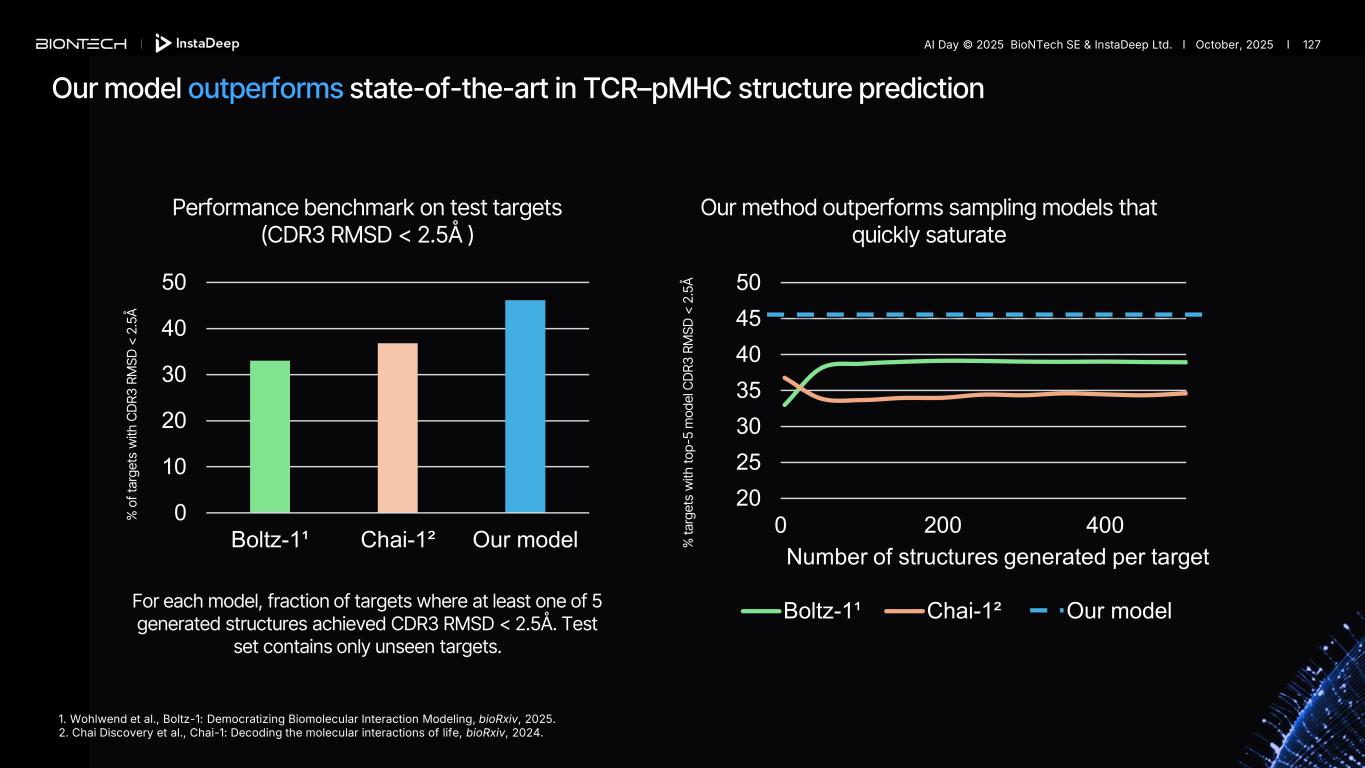 0 10 20 30 40 50 Boltz-1¹ Chai-1² Our model For each model, fraction of targets where at least one of 5 generated structures achieved CDR3 RMSD < 2.5Å. Test set contains only unseen targets. Performance benchmark on test targets (CDR3 RMSD < 2.5Å ) 1. Wohlwend et al., Boltz-1: Democratizing Biomolecular Interaction Modeling, bioRxiv, 2025. 2. Chai Discovery et al., Chai-1: Decoding the molecular interactions of life, bioRxiv, 2024. 20 25 30 35 40 45 50 0 200 400 Number of structures generated per target Boltz-1¹ Chai-1² Our model % ta rg et s w ith to p- 5 m od el C D R3 R M SD < 2 .5 Å Our method outperforms sampling models that quickly saturate % o f t ar ge ts w ith C D R3 R M SD < 2 .5 Å Our model outperforms state-of-the-art in TCR–pMHC structure prediction AI Day © 2025 BioNTech SE & InstaDeep Ltd. I October, 2025 I 127