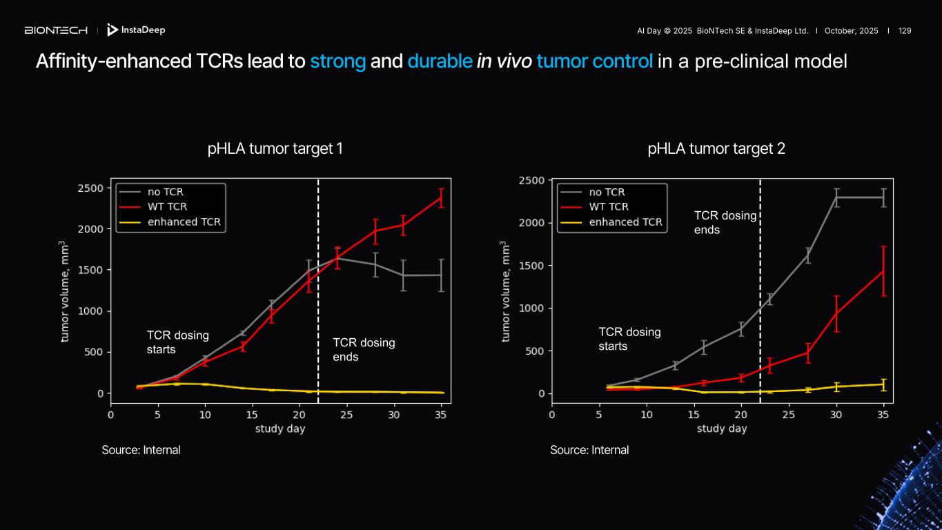 Affinity-enhanced TCRs lead to strong and durable in vivo tumor control in a pre-clinical model pHLA tumor target 1 pHLA tumor target 2 Source: Internal Source: Internal TCR dosing starts TCR dosing ends TCR dosing starts TCR dosing ends AI Day © 2025 BioNTech SE & InstaDeep Ltd. I October, 2025 I 129
