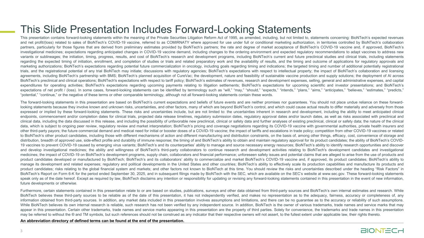 3 This Slide Presentation Includes Forward-Looking Statements This presentation contains forward-looking statements within the meaning of the Private Securities Litigation Reform Act of 1995, as amended, including, but not limited to, statements concerning: BioNTech’s expected revenues and net profit/(loss) related to sales of BioNTech’s COVID-19 vaccine, referred to as COMIRNATY where approved for use under full or conditional marketing authorization, in territories controlled by BioNTech’s collaboration partners, particularly for those figures that are derived from preliminary estimates provided by BioNTech’s partners; the rate and degree of market acceptance of BioNTech’s COVID-19 vaccine and, if approved, BioNTech’s investigational medicines; expectations regarding anticipated changes in COVID-19 vaccine demand, including changes to the ordering environment and expected regulatory recommendations to adapt vaccines to address new variants or sublineages; the initiation, timing, progress, results, and cost of BioNTech’s research and development programs, including BioNTech’s current and future preclinical studies and clinical trials, including statements regarding the expected timing of initiation, enrollment, and completion of studies or trials and related preparatory work and the availability of results, and the timing and outcome of applications for regulatory approvals and marketing authorizations; BioNTech’s expectations regarding potential future commercialization in oncology, including goals regarding timing and indications; the targeted timing and number of additional potentially registrational trials, and the registrational potential of any trial BioNTech may initiate; discussions with regulatory agencies; BioNTech’s expectations with respect to intellectual property; the impact of BioNTech’s collaboration and licensing agreements, including BioNTech’s partnership with BMS; BioNTech’s planned acquisition of CureVac; the development, nature and feasibility of sustainable vaccine production and supply solutions; the deployment of AI across BioNTech’s preclinical and clinical operations; BioNTech's expectations with respect to tariff policy; BioNTech’s estimates of revenues, research and development expenses, selling, general and administrative expenses, and capital expenditures for operating activities; BioNTech's expectations regarding upcoming payments relating to litigation settlements; BioNTech's expectations for upcoming scientific and investor presentations; and BioNTech’s expectations of net profit / (loss). In some cases, forward-looking statements can be identified by terminology such as “will,” “may,” “should,” “expects,” “intends,” “plans,” “aims,” “anticipates,” “believes,” “estimates,” “predicts,” “potential,” “continue,” or the negative of these terms or other comparable terminology, although not all forward-looking statements contain these words. The forward-looking statements in this presentation are based on BioNTech’s current expectations and beliefs of future events and are neither promises nor guarantees. You should not place undue reliance on these forward- looking statements because they involve known and unknown risks, uncertainties, and other factors, many of which are beyond BioNTech’s control, and which could cause actual results to differ materially and adversely from those expressed or implied by these forward-looking statements. These risks and uncertainties include, but are not limited to: the uncertainties inherent in research and development, including the ability to meet anticipated clinical endpoints, commencement and/or completion dates for clinical trials, projected data release timelines, regulatory submission dates, regulatory approval dates and/or launch dates, as well as risks associated with preclinical and clinical data, including the data discussed in this release, and including the possibility of unfavorable new preclinical, clinical or safety data and further analyses of existing preclinical, clinical or safety data; the nature of the clinical data, which is subject to ongoing peer review, regulatory review and market interpretation; BioNTech’s pricing and coverage negotiations regarding its COVID-19 vaccine with governmental authorities, private health insurers and other third-party payors; the future commercial demand and medical need for initial or booster doses of a COVID-19 vaccine; the impact of tariffs and escalations in trade policy; competition from other COVID-19 vaccines or related to BioNTech’s other product candidates, including those with different mechanisms of action and different manufacturing and distribution constraints, on the basis of, among other things, efficacy, cost, convenience of storage and distribution, breadth of approved use, side-effect profile and durability of immune response; the timing of and BioNTech’s ability to obtain and maintain regulatory approval for its product candidates; the ability of BioNTech’s COVID- 19 vaccines to prevent COVID-19 caused by emerging virus variants; BioNTech’s and its counterparties’ ability to manage and source necessary energy resources; BioNTech’s ability to identify research opportunities and discover and develop investigational medicines; the ability and willingness of BioNTech’s third-party collaborators to continue research and development activities relating to BioNTech's development candidates and investigational medicines; the impact of COVID-19 on BioNTech’s development programs, supply chain, collaborators and financial performance; unforeseen safety issues and potential claims that are alleged to arise from the use of products and product candidates developed or manufactured by BioNTech; BioNTech’s and its collaborators’ ability to commercialize and market BioNTech’s COVID-19 vaccine and, if approved, its product candidates; BioNTech’s ability t