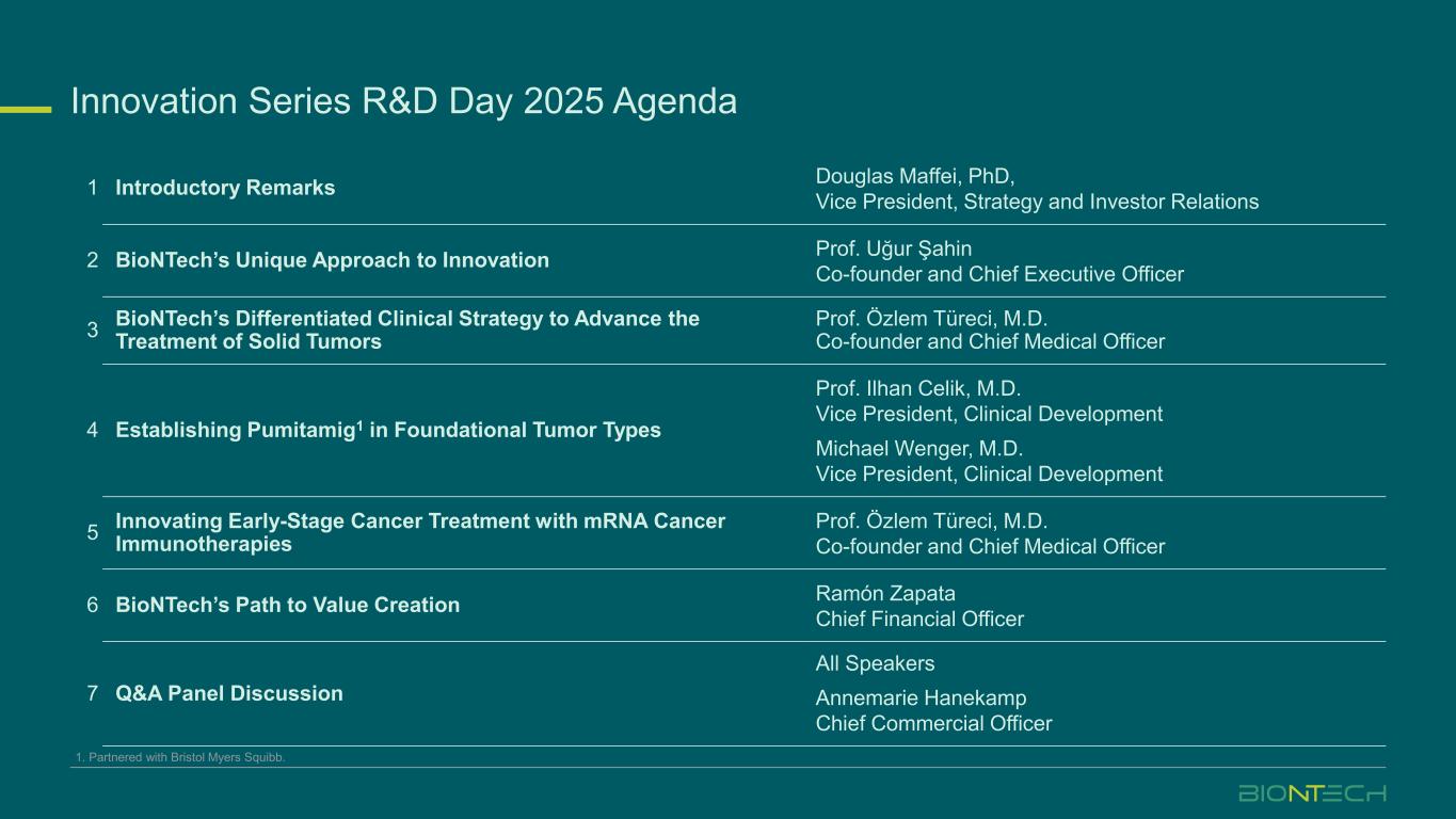 Innovation Series R&D Day 2025 Agenda 1 Introductory Remarks Douglas Maffei, PhD, Vice President, Strategy and Investor Relations 2 BioNTech’s Unique Approach to Innovation Prof. Uğur Şahin Co-founder and Chief Executive Officer 3 BioNTech’s Differentiated Clinical Strategy to Advance the Treatment of Solid Tumors Prof. Özlem Türeci, M.D. Co-founder and Chief Medical Officer 4 Establishing Pumitamig1 in Foundational Tumor Types Prof. Ilhan Celik, M.D. Vice President, Clinical Development Michael Wenger, M.D. Vice President, Clinical Development 5 Innovating Early-Stage Cancer Treatment with mRNA Cancer Immunotherapies Prof. Özlem Türeci, M.D. Co-founder and Chief Medical Officer 6 BioNTech’s Path to Value Creation Ramón Zapata Chief Financial Officer 7 Q&A Panel Discussion All Speakers Annemarie Hanekamp Chief Commercial Officer 1. Partnered with Bristol Myers Squibb.