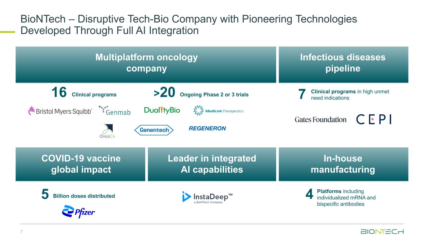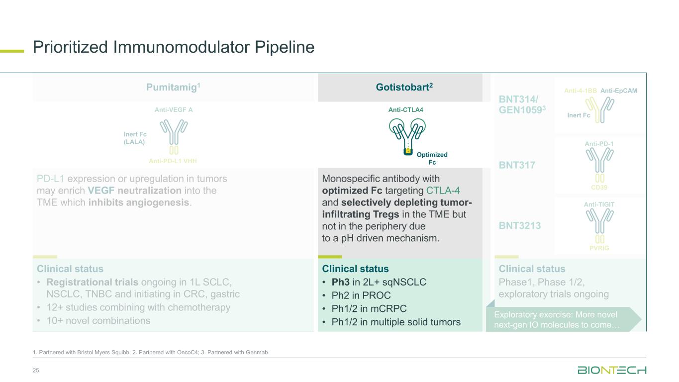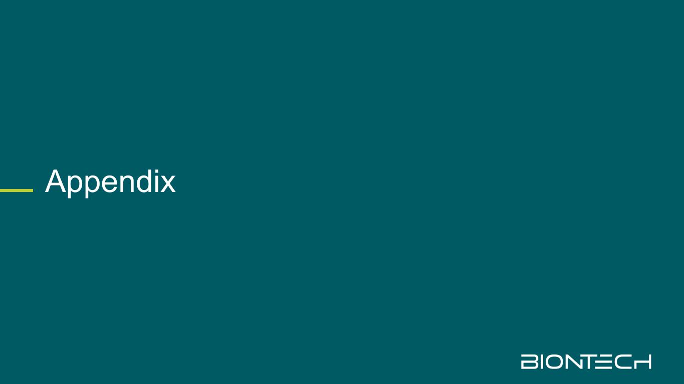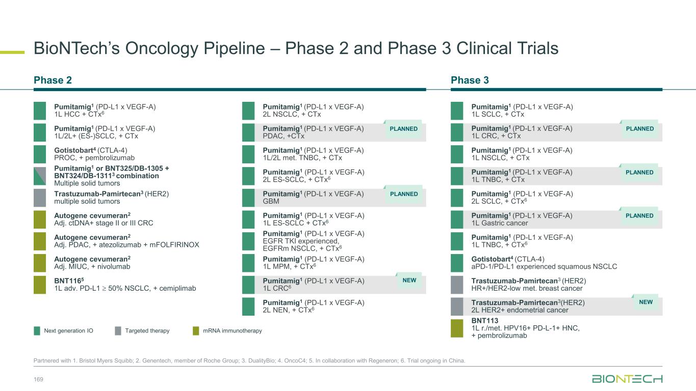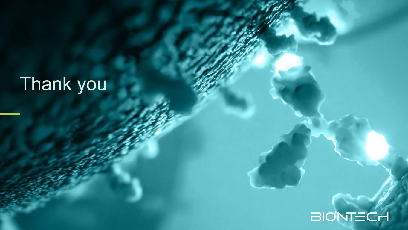 BioNTech’s Oncology Pipeline – Phase 2 and Phase 3 Clinical Trials Partnered with 1. Bristol Myers Squibb; 2. Genentech, member of Roche Group; 3. DualityBio; 4. OncoC4; 5. In collaboration with Regeneron; 6. Trial ongoing in China. Gotistobart4 (CTLA-4) PROC, + pembrolizumab Autogene cevumeran2 Adj. ctDNA+ stage II or III CRC BNT1165 1L adv. PD-L1 50% NSCLC, + cemiplimab Autogene cevumeran2 Adj. PDAC, + atezolizumab + mFOLFIRINOX Autogene cevumeran2 Adj. MIUC, + nivolumab Phase 3Phase 2 mRNA immunotherapyNext generation IO Targeted therapy Trastuzumab-Pamirtecan3 (HER2) multiple solid tumors 169 Pumitamig1 (PD-L1 x VEGF-A) 2L NSCLC, + CTx Pumitamig1 or BNT325/DB-1305 + BNT324/DB-13113 combination Multiple solid tumors Gotistobart4 (CTLA-4) aPD-1/PD-L1 experienced squamous NSCLC Trastuzumab-Pamirtecan3 (HER2) HR+/HER2-low met. breast cancer Pumitamig1 (PD-L1 x VEGF-A) 2L SCLC, + CTx6 Pumitamig1 (PD-L1 x VEGF-A) 1L TNBC, + CTx6 Pumitamig1 (PD-L1 x VEGF-A) 1L SCLC, + CTx Pumitamig1 (PD-L1 x VEGF-A) 1L NSCLC, + CTx Pumitamig1 (PD-L1 x VEGF-A) 1L TNBC, + CTx PLANNED Trastuzumab-Pamirtecan3(HER2) 2L HER2+ endometrial cancer NEW BNT113 1L r./met. HPV16+ PD-L-1+ HNC, + pembrolizumab Pumitamig1 (PD-L1 x VEGF-A) 1L/2L met. TNBC, + CTx Pumitamig1 (PD-L1 x VEGF-A) 1L/2L+ (ES-)SCLC, + CTx Pumitamig1 (PD-L1 x VEGF-A) 2L ES-SCLC, + CTx6 Pumitamig1 (PD-L1 x VEGF-A) 1L ES-SCLC + CTx6 Pumitamig1 (PD-L1 x VEGF-A) EGFR TKI experienced, EGFRm NSCLC, + CTx6 Pumitamig1 (PD-L1 x VEGF-A) 1L MPM, + CTx6 Pumitamig1 (PD-L1 x VEGF-A) 2L NEN, + CTx6 Pumitamig1 (PD-L1 x VEGF-A) 1L CRC6 NEW Pumitamig1 (PD-L1 x VEGF-A) 1L CRC, + CTx PLANNED Pumitamig1 (PD-L1 x VEGF-A) 1L Gastric cancer PLANNED Pumitamig1 (PD-L1 x VEGF-A) GBM PLANNED Pumitamig1 (PD-L1 x VEGF-A) PDAC, +CTx PLANNED Pumitamig1 (PD-L1 x VEGF-A) 1L HCC + CTx6