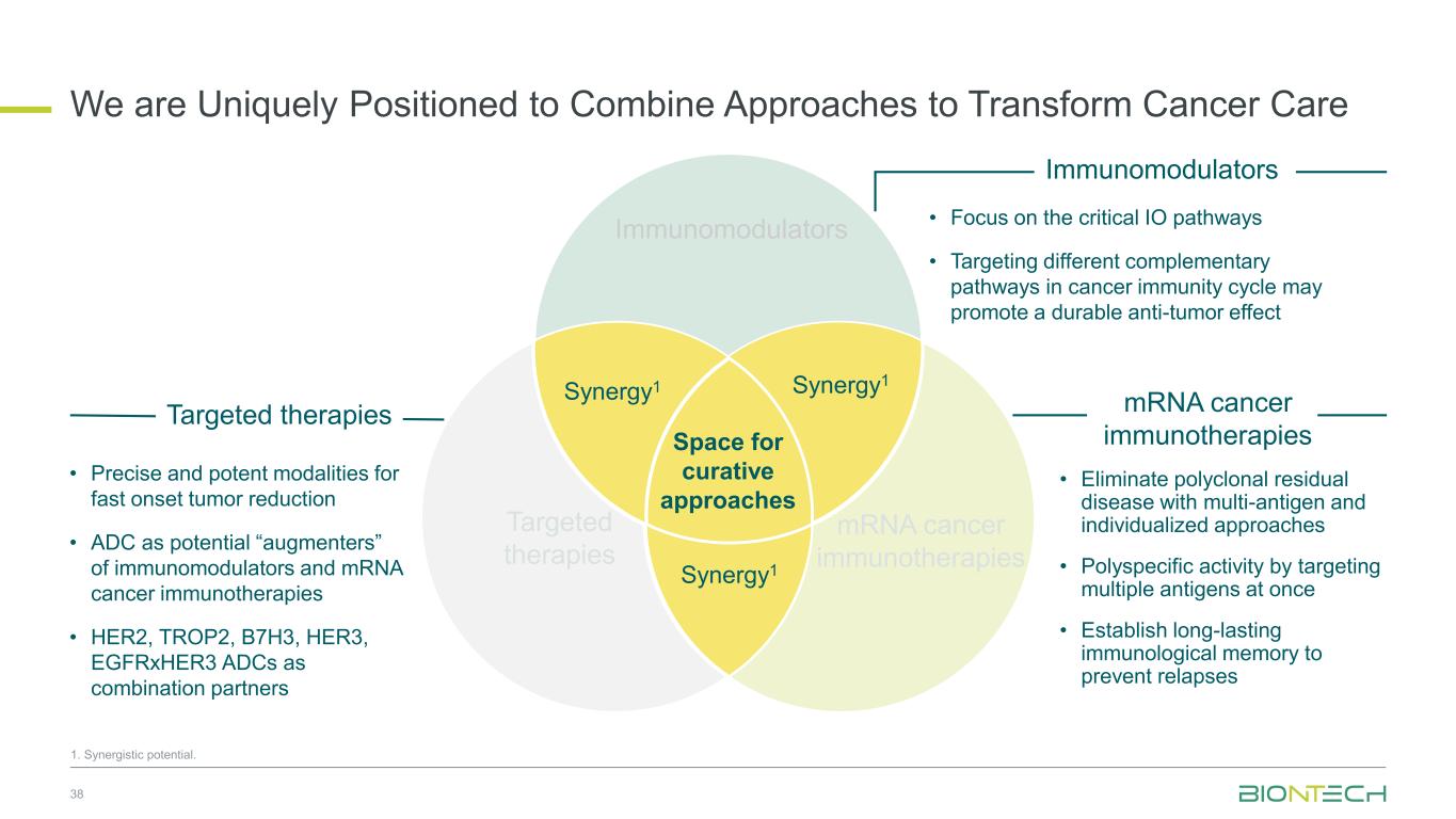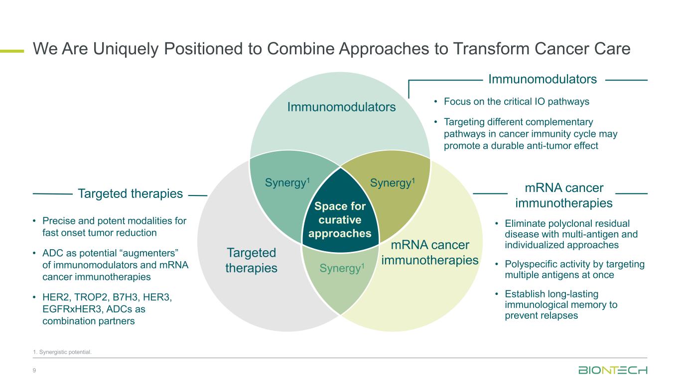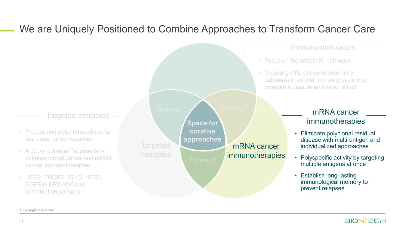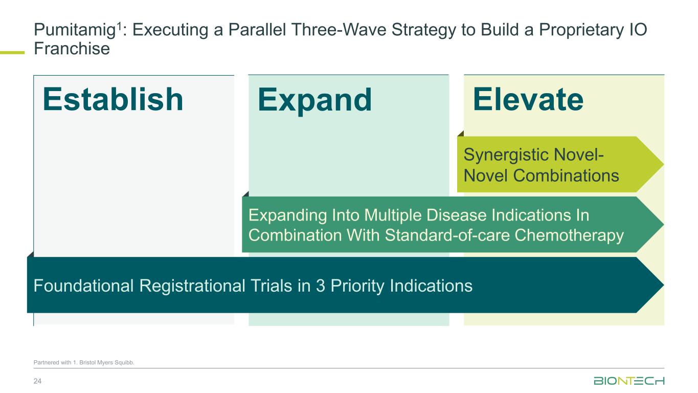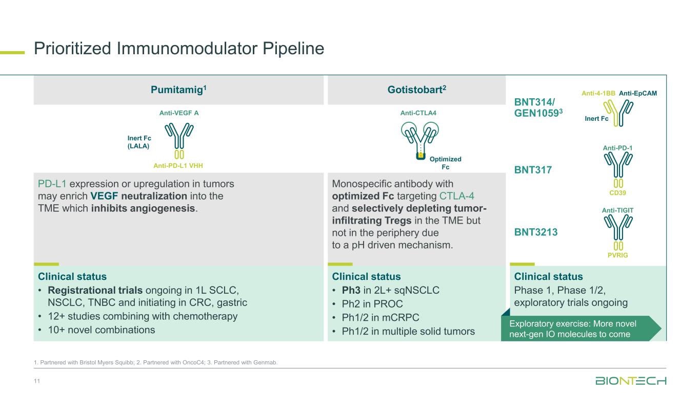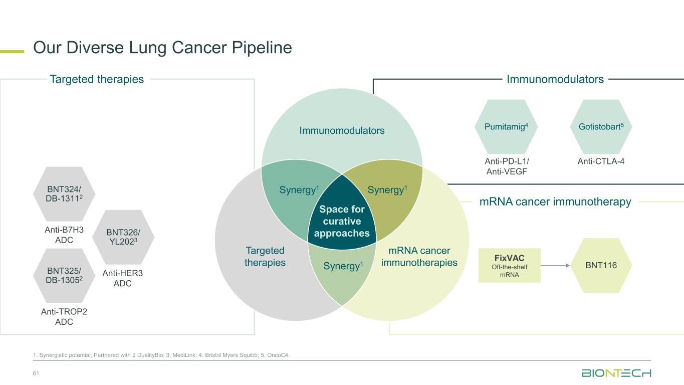 BioNTech’s Oncology Pipeline – Phase 2 and Phase 3 Clinical Trials Partnered with 1. Bristol Myers Squibb; 2. Genentech, member of Roche Group; 3. DualityBio; 4. OncoC4; 5. In collaboration with Regeneron; 6. Trial ongoing in China. Gotistobart4 (CTLA-4) PROC, + pembrolizumab Autogene cevumeran2 Adj. ctDNA+ stage II or III CRC BNT1165 1L adv. PD-L1 50% NSCLC, + cemiplimab Autogene cevumeran2 Adj. PDAC, + atezolizumab + mFOLFIRINOX Autogene cevumeran2 Adj. MIUC, + nivolumab Phase 3Phase 2 mRNA immunotherapyNext generation IO Targeted therapy Trastuzumab-Pamirtecan3 (HER2) multiple solid tumors 169 Pumitamig1 (PD-L1 x VEGF-A) 2L NSCLC, + CTx Pumitamig1 or BNT325/DB-1305 + BNT324/DB-13113 combination Multiple solid tumors Gotistobart4 (CTLA-4) aPD-1/PD-L1 experienced squamous NSCLC Trastuzumab-Pamirtecan3 (HER2) HR+/HER2-low met. breast cancer Pumitamig1 (PD-L1 x VEGF-A) 2L SCLC, + CTx6 Pumitamig1 (PD-L1 x VEGF-A) 1L TNBC, + CTx6 Pumitamig1 (PD-L1 x VEGF-A) 1L SCLC, + CTx Pumitamig1 (PD-L1 x VEGF-A) 1L NSCLC, + CTx Pumitamig1 (PD-L1 x VEGF-A) 1L TNBC, + CTx PLANNED Trastuzumab-Pamirtecan3(HER2) 2L HER2+ endometrial cancer NEW BNT113 1L r./met. HPV16+ PD-L-1+ HNC, + pembrolizumab Pumitamig1 (PD-L1 x VEGF-A) 1L/2L met. TNBC, + CTx Pumitamig1 (PD-L1 x VEGF-A) 1L/2L+ (ES-)SCLC, + CTx Pumitamig1 (PD-L1 x VEGF-A) 2L ES-SCLC, + CTx6 Pumitamig1 (PD-L1 x VEGF-A) 1L ES-SCLC + CTx6 Pumitamig1 (PD-L1 x VEGF-A) EGFR TKI experienced, EGFRm NSCLC, + CTx6 Pumitamig1 (PD-L1 x VEGF-A) 1L MPM, + CTx6 Pumitamig1 (PD-L1 x VEGF-A) 2L NEN, + CTx6 Pumitamig1 (PD-L1 x VEGF-A) 1L CRC6 NEW Pumitamig1 (PD-L1 x VEGF-A) 1L CRC, + CTx PLANNED Pumitamig1 (PD-L1 x VEGF-A) 1L Gastric cancer PLANNED Pumitamig1 (PD-L1 x VEGF-A) GBM PLANNED Pumitamig1 (PD-L1 x VEGF-A) PDAC, +CTx PLANNED Pumitamig1 (PD-L1 x VEGF-A) 1L HCC + CTx6