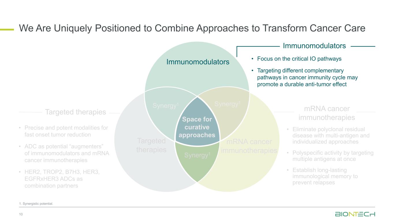 Space for curative approaches Immunomodulators mRNA cancer immunotherapies Targeted therapies Synergy1Synergy1 Synergy1 • Focus on the critical IO pathways • Targeting different complementary pathways in cancer immunity cycle may promote a durable anti-tumor effect • Eliminate polyclonal residual disease with multi-antigen and individualized approaches • Polyspecific activity by targeting multiple antigens at once • Establish long-lasting immunological memory to prevent relapses • Precise and potent modalities for fast onset tumor reduction • ADC as potential “augmenters” of immunomodulators and mRNA cancer immunotherapies • HER2, TROP2, B7H3, HER3, EGFRxHER3, ADCs as combination partners 9 Immunomodulators Targeted therapies mRNA cancer immunotherapies We Are Uniquely Positioned to Combine Approaches to Transform Cancer Care 1. Synergistic potential.