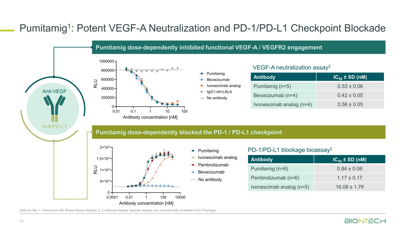 Pumitamig1: PD-L1 x VEGF-A Bispecific Antibody 12 Miao X et al. AACR 2025. Poster #6061; 1. Partnered with Bristol Myers Squibb Anti-PD-L1 VHH LALA silencing mutations Stable linkers Anti-VEGF-A PD-L1 checkpoint blockade Reverses immunosuppression of T-cells VEGF-A neutralization Vascular normalization Hypoxia Immune cell infiltration and activation Dendritic cell differentiation and maturation Regulatory T-cell proliferation Pumitamig is an investigational bispecific antibody, targeting both PD-L1 and VEGF-A. Binding to PD-L1 is intended to restore effector T-cell function and localize VEGF-A neutralization within the TME, reversing the negative impact of VEGF signaling on immune cell infiltration and activation and normalizing tumor vasculature, leading to tumor growth inhibition.