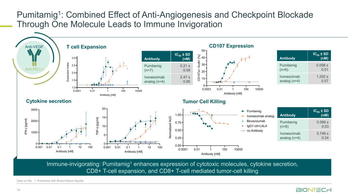 13 Anti-PD-L1 Anti-VEGFnti- F Pumitamig dose-dependently inhibited functional VEGF-A / VEGFR2 engagement 0.01 0.1 1 10 100 0 200000 400000 600000 800000 1000000 Antibody concentration [nM] R L U Pumitamig Bevacizumab Ivonescimab analog IgG1-ctrl-LALA No antibody... Antibody IC50 ± SD (nM) Pumitamig (n=5) 0.53 ± 0.06 Bevacizumab (n=4) 0.42 ± 0.05 Ivonescimab analog (n=4) 0.56 ± 0.05 Pumitamig dose-dependently blocked the PD-1 / PD-L1 checkpoint 0.0001 0.01 1 100 10000 0 5×104 1×105 1.5×105 2×105 Antibody concentration [nM] R L U Pumitamig Ivonescimab analog Bevacizumab Pembrolizumab No antibody Antibody IC50 ± SD (nM) Pumitamig (n=6) 0.84 ± 0.06 Pembrolizumab (n=6) 1.17 ± 0.17 Ivonescimab analog (n=5) 16.08 ± 1.76 VEGF-A neutralization assay2 PD-1/PD-L1 blockage bioassay2 Data on file. 1. Partnered with Bristol Myers Squibb; 2. Luciferase-based reporter assays are commercially available from Promega. Pumitamig1: Potent VEGF-A Neutralization and PD-1/PD-L1 Checkpoint Blockade