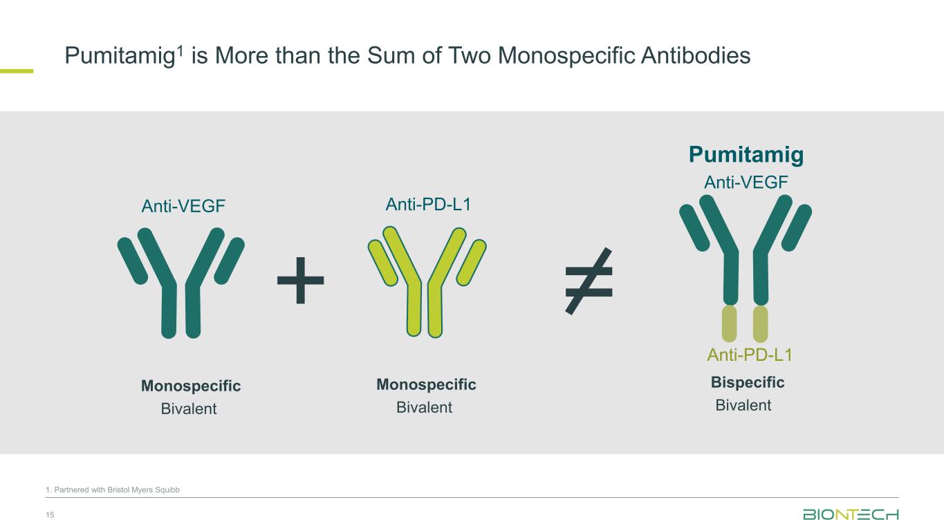 0.0001 0.01 1 100 10000 0 10 20 30 40 50 CD107a/GrzmB expression Antibody [nM] C D 1 0 7 a + G rz B + [ % ] 0.001 0.01 0.1 1 10 100 0 1000 2000 3000 Antibody [nM] IF N -γ [ p g /m l] 0.001 0.01 0.1 1 10 100 0 5 10 15 20 Antibody [nM] T N F -α [ p g /m l] 0.001 0.01 0.1 1 10 100 0 10 20 30 40 Antibody [nM] IL -2 [ p g /m l] T cell Expansion Cytokine secretion 0.0001 0.01 1 100 10000 1.0 1.5 2.0 2.5 3.0 Antibody [nM] E x p a n s io n I n d e x Pumitamig Ivonescimab analog Bevacizumab IgG1-ctrl-LALA no Antibody Data on file. 1. Partnered with Bristol Myers Squibb 14 Pumitamig1: Combined Effect of Anti-Angiogenesis and Checkpoint Blockade Through One Molecule Leads to Immune Invigoration Immune-invigorating: Pumitamig1 enhances expression of cytotoxic molecules, cytokine secretion, CD8+ T-cell expansion, and CD8+ T-cell mediated tumor-cell killing Anti-PD-L1 Anti-VEGFti- Antibody IC50 ± SD (nM) Pumitamig (n=7) 0.21 ± 0.09 Ivonescimab analog (n=4) 2.47 ± 0.95 Antibody IC50 ± SD (nM) Pumitamig (n=6) 0.069 ± 0.03 Ivonescimab analog (n=4) 0.746 ± 0.24 Antibody IC50 ± SD (nM) Pumitamig (n=6) 0.058 ± 0.01 Ivonescimab analog (n=4) 1.202 ± 0.57 0.0001 0.01 1 100 10000 0.00 0.25 0.50 0.75 1.00 Tumor-cell killing Antibody [nM] N o rm a liz e d A U C Pumitamig Ivonescimab analog Bevacizumab IgG1-ctrl-LALA no Antibody Tumor Cell Killi CD107 Expression