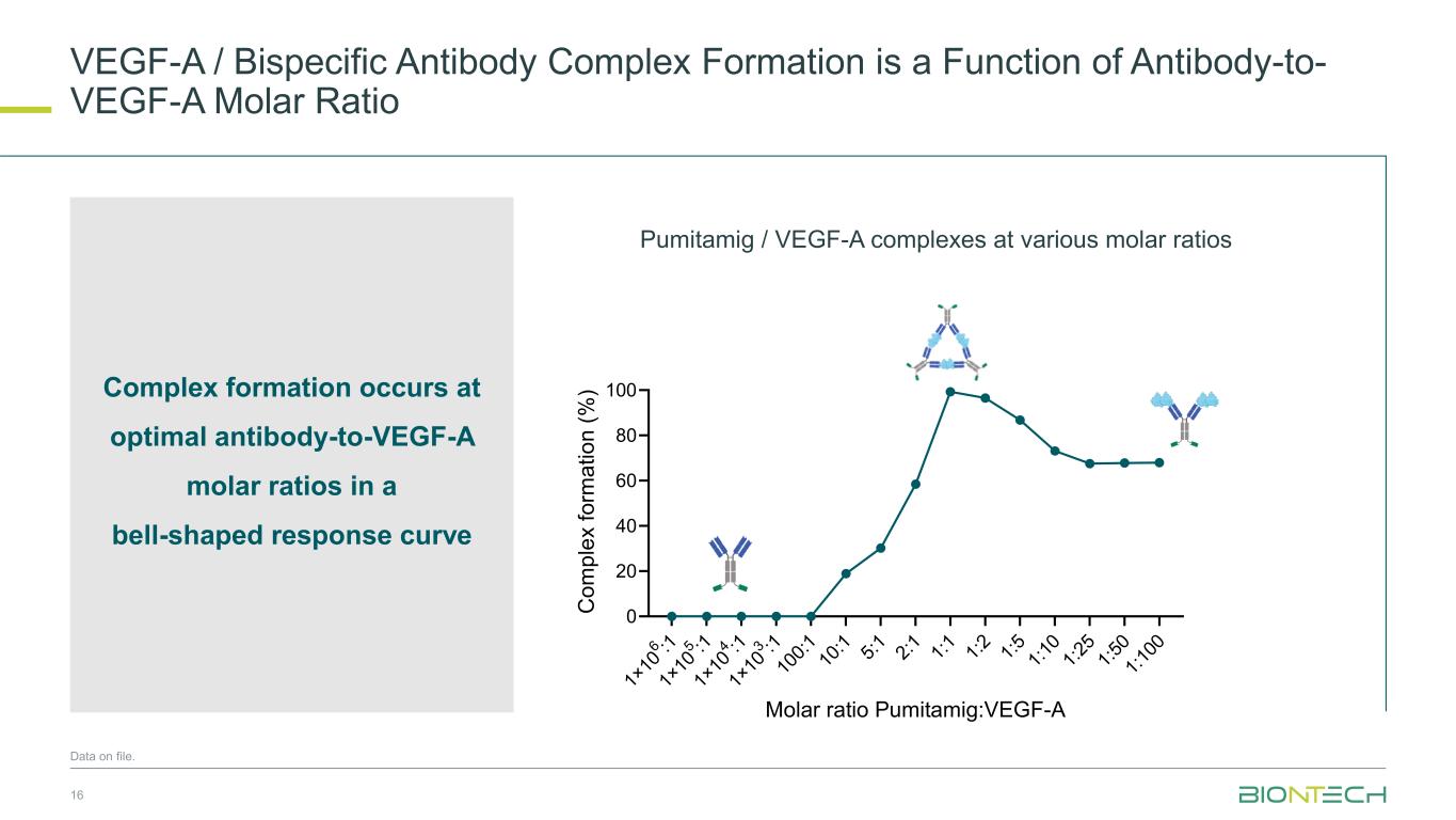 VEGF-A / Bispecific Antibody Complex Formation is a Function of Antibody-to- VEGF-A Molar Ratio 16 Data on file. Complex formation occurs at optimal antibody-to-VEGF-A molar ratios in a bell-shaped response curve 1× 10 6 :1 1× 10 5 :1 1× 10 4 :1 1× 10 3 :1 10 0: 1 10 :1 5: 1 2: 1 1: 1 1: 2 1: 5 1: 10 1: 25 1: 50 1: 10 0 0 20 40 60 80 100 Molar ratio Pumitamig:VEGF-A C o m p le x f o rm a ti o n ( % ) D. % Pumitamig/VEGF-A complexes at various molar ratios Pumitamig / VEGF-A complexes at various molar ratios