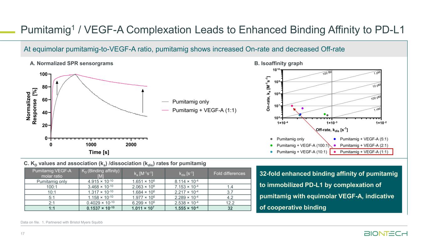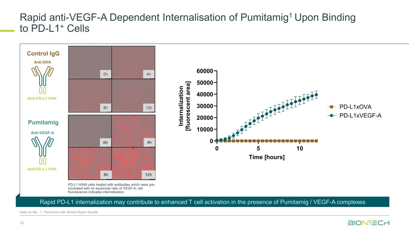 1×10 -4 1×10 -3 1×10 -2 106 107 108 109 1010 Off-rate, kdis [s-1] O n -r a te , k a [ M -1 s -1 ] Pumitamig only Pumitamig + VEGF-A (100:1) Pumitamig + VEGF-A (10:1) Pumitamig + VEGF-A (5:1) Pumitamig + VEGF-A (2:1) Pumitamig + VEGF-A (1:1) 100 fM 1 pM 10 pM 100 pM 1 nM Pumitamig1 / VEGF-A Complexation Leads to Enhanced Binding Affinity to PD-L1 17 Data on file. 1. Partnered with Bristol Myers Squibb 0 1000 2000 0 20 40 60 80 100 Time [s] N o rm a li z e d R e s p o n s e [% ] Pumitamig only Pumitamig + VEGF-A (1:1) Pumitamig:VEGF-A molar ratio KD (Binding affinity) [M] ka [M-1s-1] kdis [s-1] Fold differences Pumitamig only 4.915 × 10-10 1.651 × 106 8.114 × 10-4 100:1 3.468 × 10-10 2.063 × 106 7.153 × 10-4 1.4 10:1 1.317 × 10-10 1.684 × 106 2.217 × 10-4 3.7 5:1 1.158 × 10-10 1.977 × 106 2.289 × 10-4 4.2 2:1 0.4029 × 10-10 6.299 × 106 2.538 × 10-4 12.2 1:1 0.1537 × 10-10 1.011 × 107 1.555 × 10-4 32 A. Normalized SPR sensorgrams B. Isoaffinity graph C. KD values and association (ka) /dissociation (kdis) rates for pumitamig At equimolar pumitamig-to-VEGF-A ratio, pumitamig shows increased On-rate and decreased Off-rate 32-fold enhanced binding affinity of pumitamig to immobilized PD-L1 by complexation of pumitamig with equimolar VEGF-A, indicative of cooperative binding
