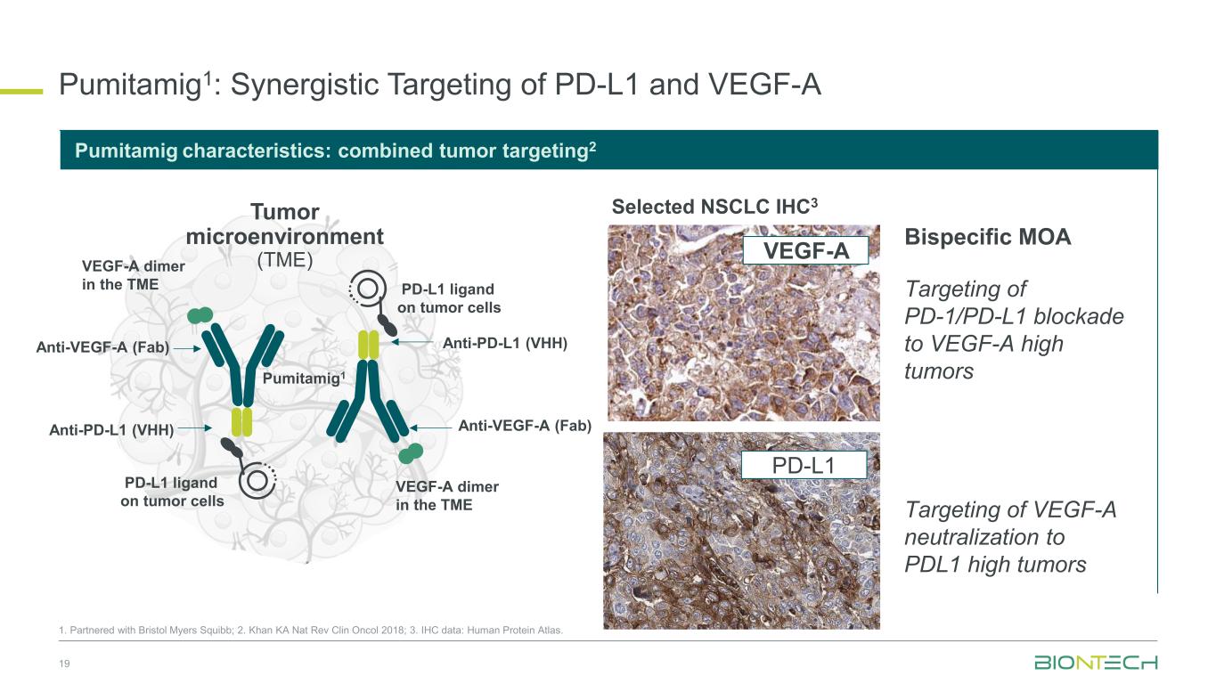 18 0 5 10 0 10000 20000 30000 40000 50000 60000 Time [hours] In te rn a li z a ti o n [f lu o re s c e n t a re a ] PD-L1xVEGF-A PD-L1xOVA Anti-VEGF-A Anti-PD-L1 VHH Anti-OVA Anti-PD-L1 VHH Rapid anti-VEGF-A Dependent Internalisation of Pumitamig1 Upon Binding to PD-L1+ Cells Data on file. 1. Partnered with Bristol Myers Squibb PD-L1+A549 cells treated with antibodies which were pre- incubated with an equimolar ratio of VEGF-A; red fluorescence indicates internalization Rapid PD-L1 internalization may contribute to enhanced T cell activation in the presence of Pumitamig / VEGF-A complexes Control IgG Pumitamig