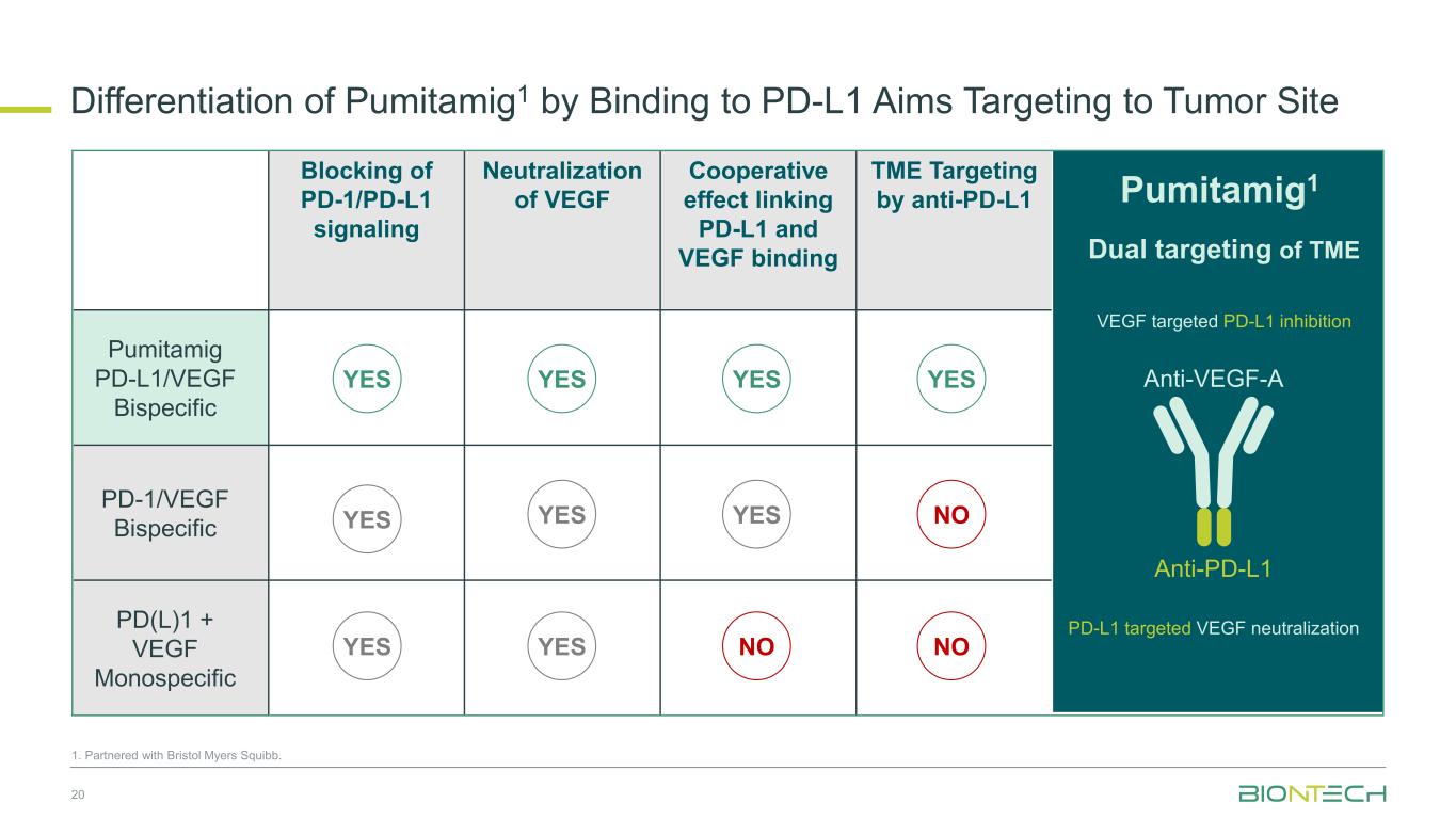 Pumitamig1: Synergistic Targeting of PD-L1 and VEGF-A 19 Targeting of PD-1/PD-L1 blockade to VEGF-A high tumors PD-L1 ligand binding on tumor cells Selected NSCLC IHC3 Bispecific MOA Anti-VEGF-A (Fab) Anti-PD-L1 (VHH) VEGF-A dimer in the TME PD-L1 ligand on tumor cells Tumor microenvironment (TME) Pumitamig1 VEGF-A dimer in the TME Anti-VEGF-A (Fab) Anti-PD-L1 (VHH) Pumitamig characteristics: combined tumor targeting2 PD-L1 ligand on tumor cells 1. Partnered with Bristol Myers Squibb; 2. Khan KA Nat Rev Clin Oncol 2018; 3. IHC data: Human Protein Atlas. VEGF-A PD-L1 Targeting of VEGF-A neutralization to PDL1 high tumors