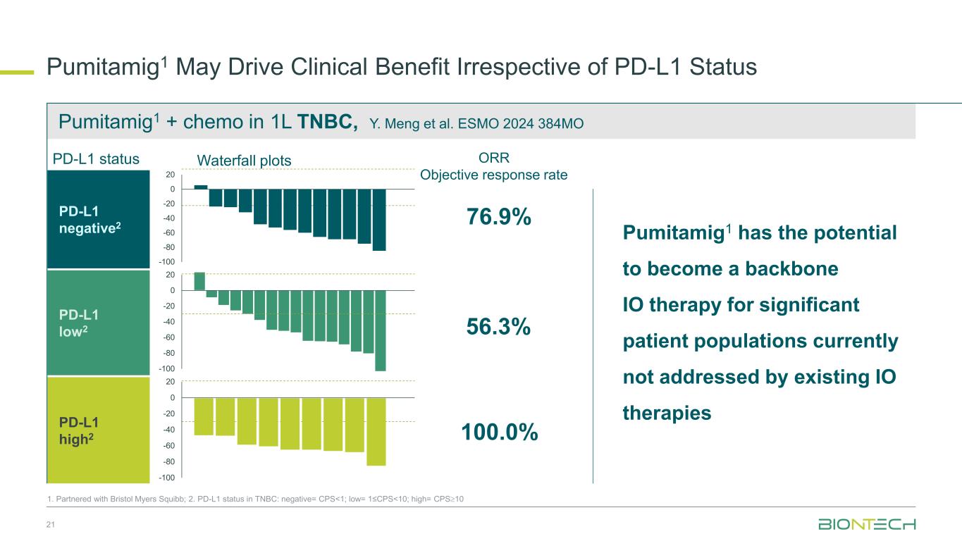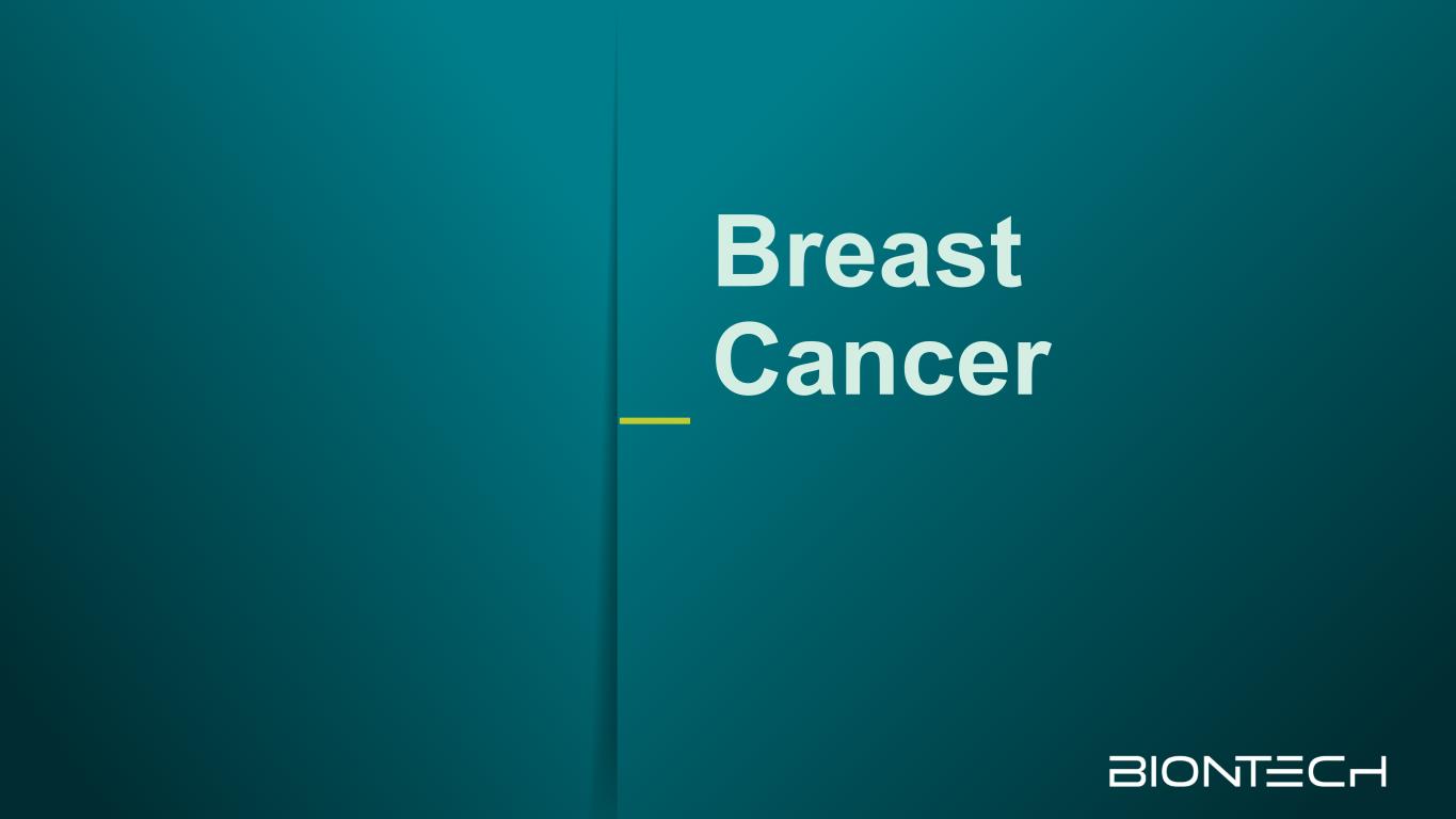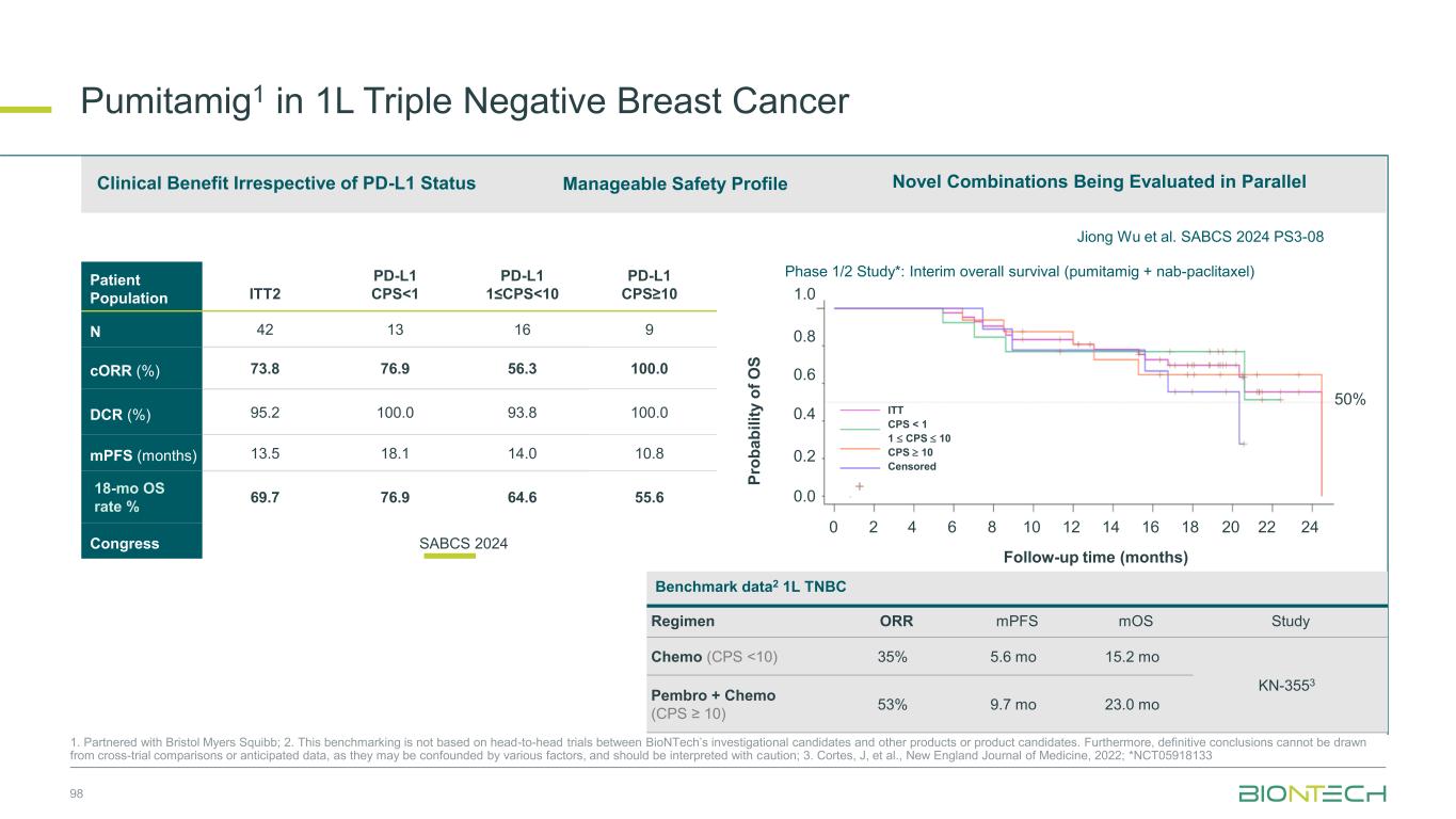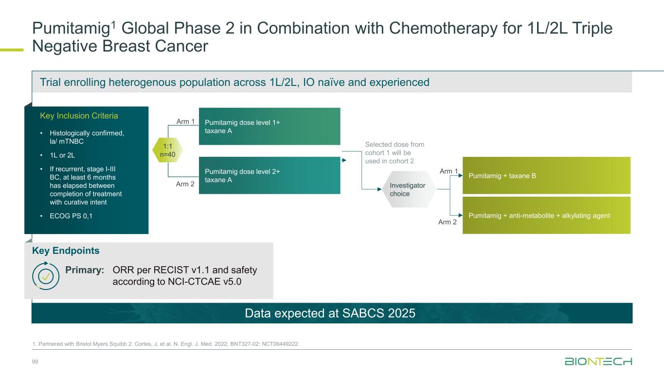 98 Patient Population ITT2 PD-L1 CPS<1 PD-L1 1≤CPS<10 PD-L1 CPS≥10 N 42 13 16 9 cORR (%) 73.8 76.9 56.3 100.0 DCR (%) 95.2 100.0 93.8 100.0 mPFS (months) 13.5 18.1 14.0 10.8 18-mo OS rate % 69.7 76.9 64.6 55.6 Congress SABCS 2024 Novel Combinations Being Evaluated in ParallelManageable Safety ProfileClinical Benefit Irrespective of PD-L1 Status Jiong Wu et al. SABCS 2024 PS3-08 Pumitamig1 in 1L Triple Negative Breast Cancer 1. Partnered with Bristol Myers Squibb; 2. This benchmarking is not based on head-to-head trials between BioNTech’s investigational candidates and other products or product candidates. Furthermore, definitive conclusions cannot be drawn from cross-trial comparisons or anticipated data, as they may be confounded by various factors, and should be interpreted with caution; 3. Cortes, J, et al., New England Journal of Medicine, 2022; *NCT05918133 0 2 4 6 8 10 12 14 16 18 20 22 24 Follow-up time (months) P ro b a b il it y o f O S 1.0 0.8 0.6 0.4 0.2 0.0 50% + ITT CPS < 1 1 CPS 10 CPS 10 Censored Phase 1/2 Study*: Interim overall survival (pumitamig + nab-paclitaxel) Benchmark data2 1L TNBC Regimen ORR mPFS mOS Study Chemo (CPS <10) 35% 5.6 mo 15.2 mo KN-3553 Pembro + Chemo (CPS ≥ 10) 53% 9.7 mo 23.0 mo