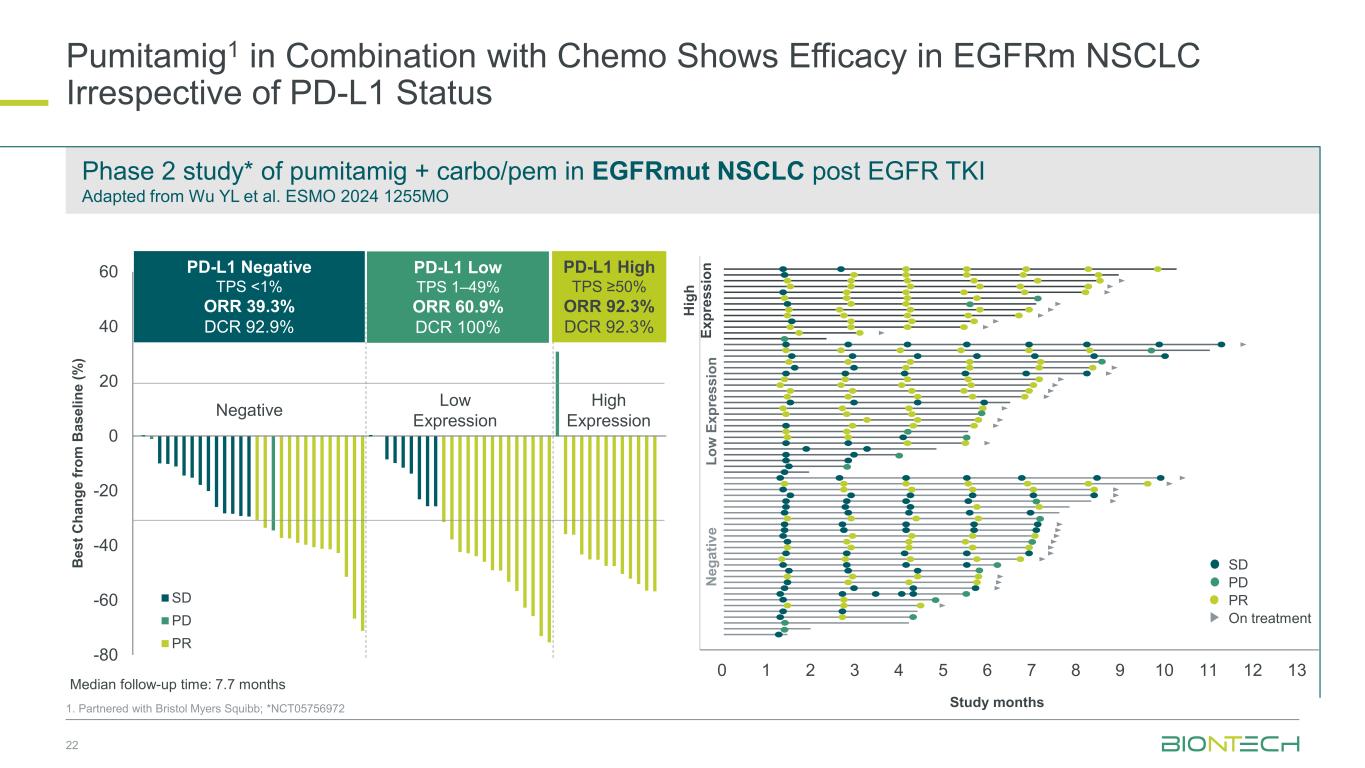 Pumitamig1 + chemo in 1L TNBC, Y. Meng et al. ESMO 2024 384MO Pumitamig1 May Drive Clinical Benefit Irrespective of PD-L1 Status 21 76.9% 56.3% 100.0% ORR Objective response rate Pumitamig1 has the potential to become a backbone IO therapy for significant patient populations currently not addressed by existing IO therapies PD-L1 negative2 PD-L1 low2 PD-L1 high2 -100 -80 -60 -40 -20 0 20 -100 -80 -60 -40 -20 0 20 -100 -80 -60 -40 -20 0 20 1. Partnered with Bristol Myers Squibb; 2. PD-L1 status in TNBC: negative= CPS<1; low= 1≤CPS<10; high= CPS10 Waterfall plotsPD-L1 status