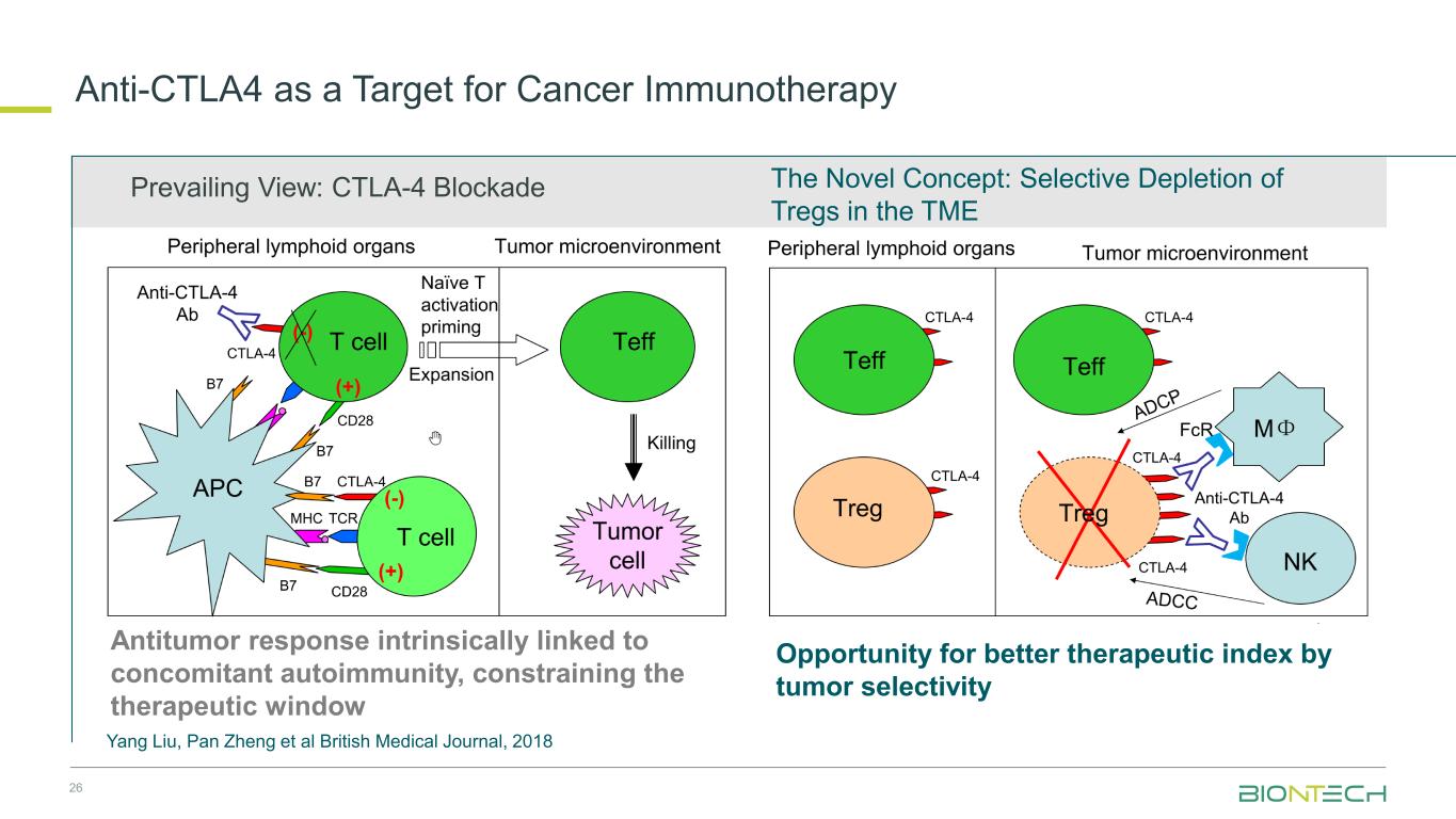 Prioritized Immunomodulator Pipeline 25 1. Partnered with Bristol Myers Squibb; 2. Partnered with OncoC4; 3. Partnered with Genmab. Anti-EpCAMAnti-4-1BB Inert Fc Anti-PD-1 CD39 Anti-TIGIT PVRIG Clinical status Phase1, Phase 1/2, exploratory trials ongoing BNT314/ GEN10593 BNT3213 BNT317 Anti-VEGF A Anti-PD-L1 VHH Inert Fc (LALA) Anti-CTLA4 Optimized Fc PD-L1 expression or upregulation in tumors may enrich VEGF neutralization into the TME which inhibits angiogenesis. Monospecific antibody with optimized Fc targeting CTLA-4 and selectively depleting tumor- infiltrating Tregs in the TME but not in the periphery due to a pH driven mechanism. Clinical status • Ph3 in 2L+ sqNSCLC • Ph2 in PROC • Ph1/2 in mCRPC • Ph1/2 in multiple solid tumors Clinical status • Registrational trials ongoing in 1L SCLC, NSCLC, TNBC and initiating in CRC, gastric • 12+ studies combining with chemotherapy • 10+ novel combinations Exploratory exercise: More novel next-gen IO molecules to come… Pumitamig1 Gotistobart2