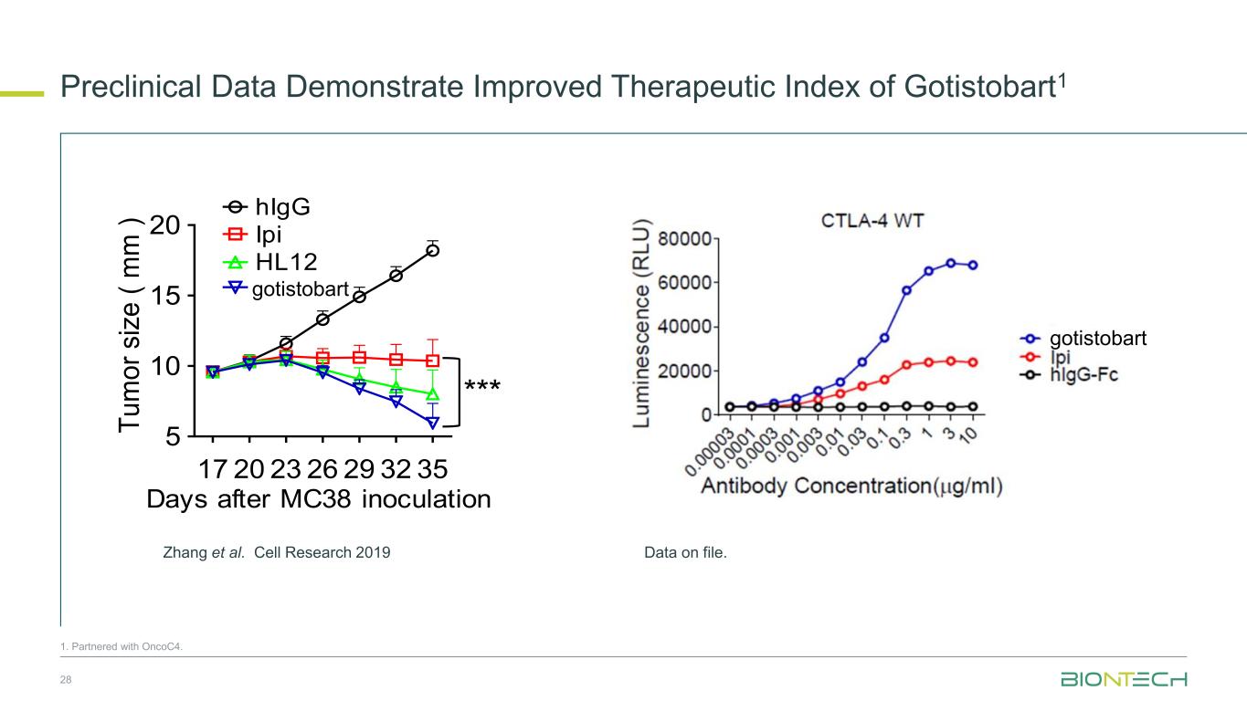 Preclinical Data Demonstrate Improved Therapeutic Index of Gotistobart1 28 Days after MC38 inoculation 17 20 23 26 29 32 35 5 10 15 20 hIgG Ipi HL12 HL32 Days after MC38 inoculation T u m o r si ze ( m m ) * hIg Ipi HL12 HL32 *** -100 0 500 1000 T u m o r v o lu m e c h a n g e f ro m b a s e lin e (% ) hIgG Ipi HL12 HL32 17 20 23 26 29 32 35 5 10 15 20 hIg Ipi. HL12 HL32 Days after MC38 inoculation T u m o r si ze ( m m ) Zhang et al. Cell Research 2019 gotistobart gotistobart 1. Partnered with OncoC4. Data on file.