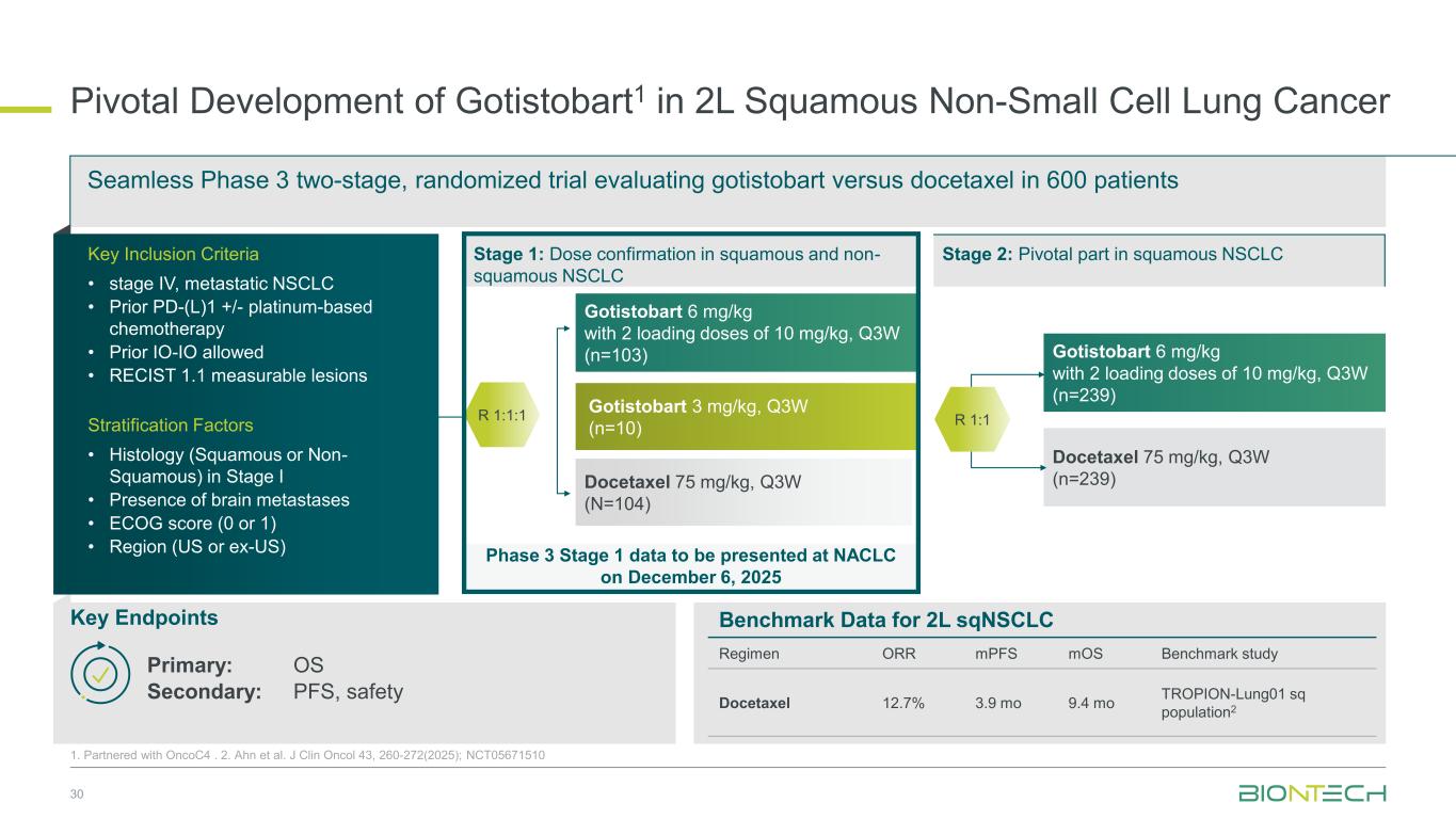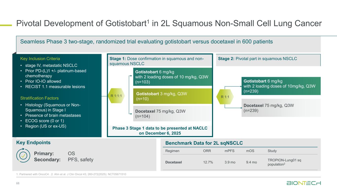 Phase 3 Stage 1 data to be presented at NACLC on December 6, 2025 Pivotal Development of Gotistobart1 in 2L Squamous Non-Small Cell Lung Cancer 68 1. Partnered with OncoC4 . 2. Ahn et al. J Clin Oncol 43, 260-272(2025); NCT05671510 Gotistobart 6 mg/kg with 2 loading doses of 10mg/kg, Q3W (n=239) Docetaxel 75 mg/kg, Q3W (n=239) Gotistobart 6 mg/kg with 2 loading doses of 10 mg/kg, Q3W (n=103) Gotistobart 3 mg/kg, Q3W (n=10) Docetaxel 75 mg/kg, Q3W (n=104) Seamless Phase 3 two-stage, randomized trial evaluating gotistobart versus docetaxel in 600 patients Key Endpoints Primary: OS Secondary: PFS, safety Stage 1: Dose confirmation in squamous and non- squamous NSCLC R 1:1 Stage 2: Pivotal part in squamous NSCLCKey Inclusion Criteria • stage IV, metastatic NSCLC • Prior PD-(L)1 +/- platinum-based chemotherapy • Prior IO-IO allowed • RECIST 1.1 measurable lesions Stratification Factors • Histology (Squamous or Non- Squamous) in Stage I • Presence of brain metastases • ECOG score (0 or 1) • Region (US or ex-US) R 1:1:1 Benchmark Data for 2L sqNSCLC Regimen ORR mPFS mOS Study Docetaxel 12.7% 3.9 mo 9.4 mo TROPION-Lung01 sq population2