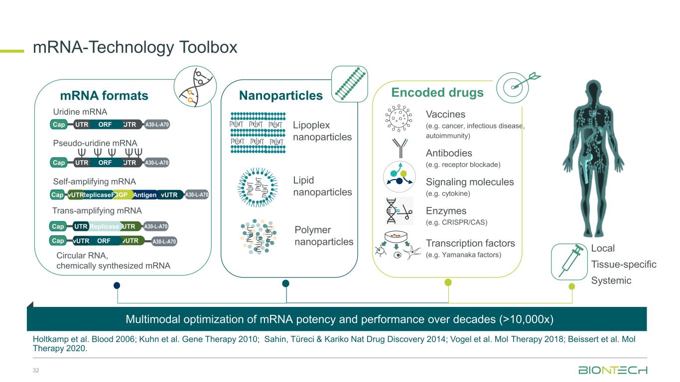 mRNA-Technology Toolbox Holtkamp et al. Blood 2006; Kuhn et al. Gene Therapy 2010; Sahin, Türeci & Kariko Nat Drug Discovery 2014; Vogel et al. Mol Therapy 2018; Beissert et al. Mol Therapy 2020. mRNA formats Local Tissue-specific Systemic Lipoplex nanoparticles Lipid nanoparticles Polymer nanoparticles Uridine mRNA Pseudo-uridine mRNA Self-amplifying mRNA Trans-amplifying mRNA Nanoparticles Vaccines (e.g. cancer, infectious disease, autoimmunity) Antibodies (e.g. receptor blockade) Signaling molecules (e.g. cytokine) Enzymes (e.g. CRISPR/CAS) Transcription factors (e.g. Yamanaka factors) Encoded drugs A30-L-A70Cap UTRORFUTR A30-L-A70Cap UTRORFUTR vUTR A30-L-A70Cap AntigenSGPReplicaseFvUTR A30-L-A70Cap UTRReplicaseUTR vUTR A30-L-A70Cap ORFvUTR Circular RNA, chemically synthesized mRNA Multimodal optimization of mRNA potency and performance over decades (>10,000x) 32