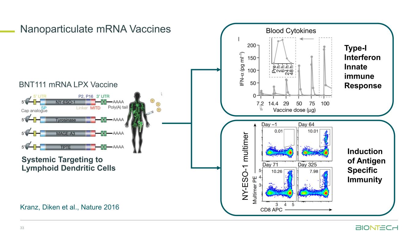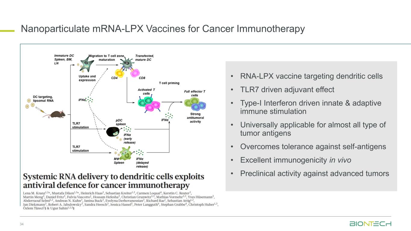 Type-I Interferon Innate immune Response N Y -E S O -1 m u lt im e r Induction of Antigen Specific Immunity Blood Cytokines BNT111 mRNA LPX Vaccine Systemic Targeting to Lymphoid Dendritic Cells Kranz, Diken et al., Nature 2016 33 Nanoparticulate mRNA Vaccines
