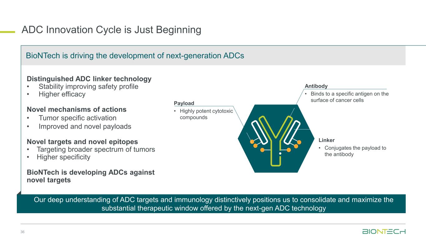 Space for curative approaches Immunomodulators mRNA cancer immunotherapies Targeted therapies Synergy1 Synergy1 Synergy1 • Focus on the critical IO pathways • Targeting different complementary pathways in cancer immunity cycle may promote a durable anti-tumor effect • Eliminate polyclonal residual disease with multi-antigen and individualized approaches • Polyspecific activity by targeting multiple antigens at once • Establish long-lasting immunological memory to prevent relapses • Precise and potent modalities for fast onset tumor reduction • ADC as potential “augmenters” of immunomodulators and mRNA cancer immunotherapies • HER2, TROP2, B7H3, HER3, EGFRxHER3 ADCs as combination partners 35 Immunomodulators Targeted therapies mRNA cancer immunotherapies We are Uniquely Positioned to Combine Approaches to Transform Cancer Care 1. Synergistic potential.