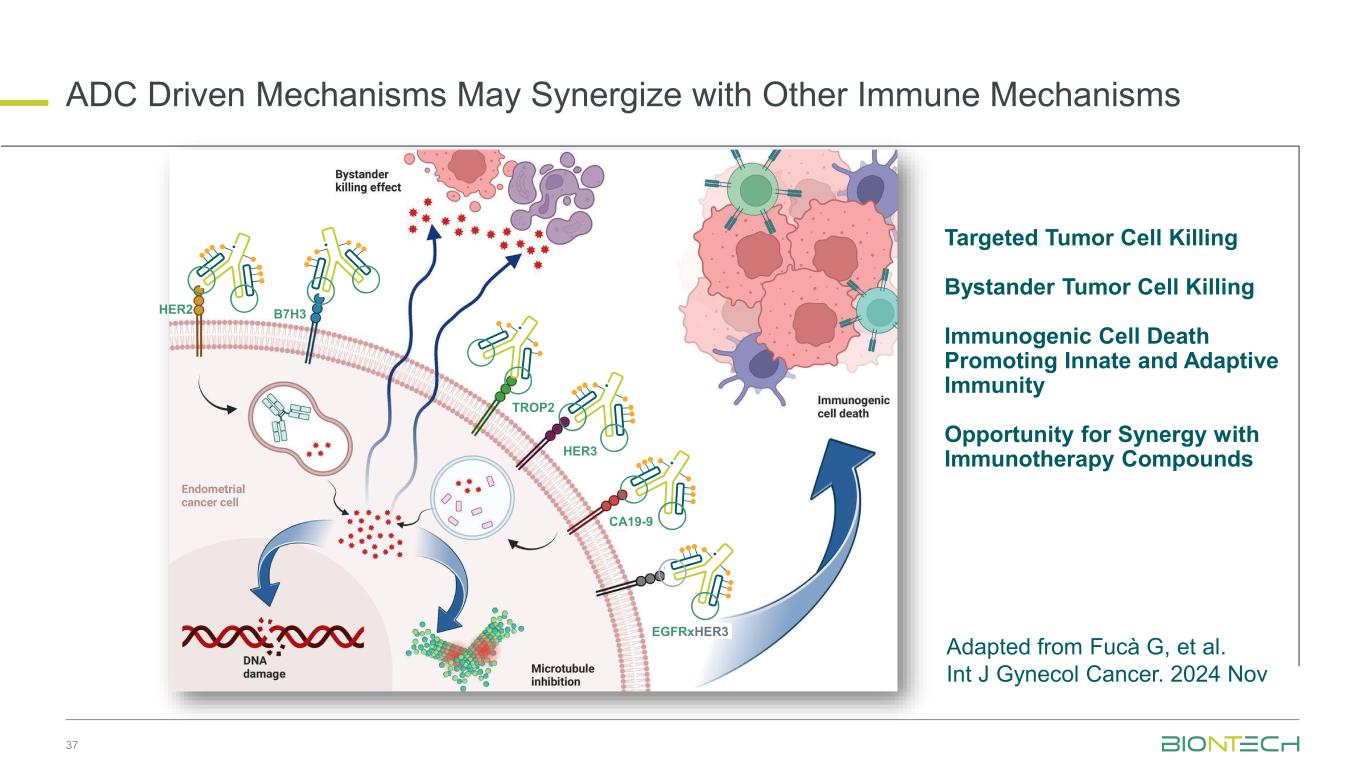 36 ADC Innovation Cycle is Just Beginning Distinguished ADC linker technology • Stability improving safety profile • Higher efficacy Novel mechanisms of actions • Tumor specific activation • Improved and novel payloads Novel targets and novel epitopes • Targeting broader spectrum of tumors • Higher specificity BioNTech is developing ADCs against novel targets Linker • Conjugates the payload to the antibody Antibody • Binds to a specific antigen on the surface of cancer cells Payload • Highly potent cytotoxic compounds BioNTech is driving the development of next-generation ADCs Our deep understanding of ADC targets and immunology distinctively positions us to consolidate and maximize the substantial therapeutic window offered by the next-gen ADC technology