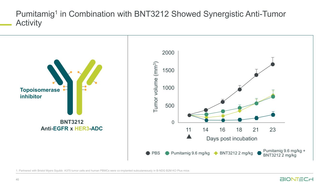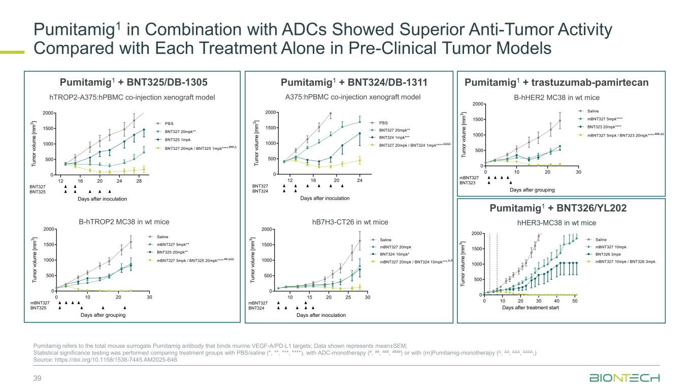 Pumitamig1 in Combination with ADCs Showed Superior Anti-Tumor Activity Compared with Each Treatment Alone in Pre-Clinical Tumor Models 39 Pumitamig refers to the total mouse surrogate Pumitamig antibody that binds murine VEGF-A/PD-L1 targets; Data shown represents mean±SEM; Statistical significance testing was performed comparing treatment groups with PBS/saline (*, **, ***, ****), with ADC-monotherapy (#, ##, ###, ####) or with (m)Pumitamig-monotherapy (Δ, ΔΔ, ΔΔΔ, ΔΔΔΔ,) Source: https://doi.org/10.1158/1538-7445.AM2025-648 hTROP2-A375:hPBMC co-injection xenograft model B-hTROP2 MC38 in wt mice A375:hPBMC co-injection xenograft model hHER3-MC38 in wt mice B-hHER2 MC38 in wt mice hB7H3-CT26 in wt mice Pumitamig1 + BNT325/DB-1305 Pumitamig1 + BNT324/DB-1311 Pumitamig1 + trastuzumab-pamirtecan Pumitamig1 + BNT326/YL202 0 10 20 30 40 50 0 500 1000 1500 2000 Days after treatment start T u m o r v o lu m e [ m m 3 ] mBNT327 10mpk Saline BNT326 3mpk mBNT327 10mpk / BNT326 3mpk 12 16 20 24 28 0 500 1000 1500 2000 Days after inoculation T u m o r vo lu m e [ m m 3 ] BNT327 20mpk** PBS BNT325 1mpk BNT327 20mpk / BNT325 1mpk**** ,###,Δ BNT327 BNT325 12 16 20 24 0 500 1000 1500 2000 Days after inoculation T u m o r v o lu m e [ m m 3 ] BNT327 20mpk** PBS BNT324 1mpk*** BNT327 20mpk / BNT324 1mpk**** ,ΔΔΔΔ BNT327 BNT324 0 10 20 30 0 500 1000 1500 2000 Days after grouping T u m o r v o lu m e [ m m 3 ] mBNT327 5mpk**** Saline BNT323 20mpk**** mBNT327 5mpk / BNT323 20mpk**** ,###,ΔΔ mBNT327 BNT323 0 10 20 30 0 500 1000 1500 2000 Days after grouping T u m o r v o lu m e [ m m 3 ] mBNT327 5mpk** Saline BNT325 20mpk** mBNT327 5mpk / BNT325 20mpk**** ,##,ΔΔΔ mBNT327 BNT325 10 15 20 25 30 0 500 1000 1500 2000 Days after inoculation T u m o r vo lu m e [ m m 3 ] mBNT327 20mpk Saline BNT324 10mpk* mBNT327 20mpk / BNT324 10mpk*** ,Δ,# mBNT327 BNT324