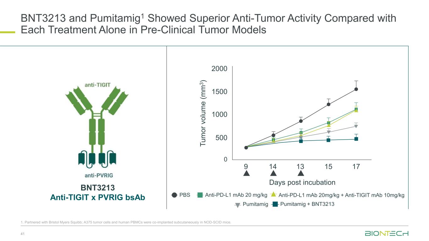 Pumitamig1 in Combination with BNT3212 Showed Synergistic Anti-Tumor Activity 40 1. Partnered with Bristol Myers Squibb. A375 tumor cells and human PBMCs were co-implanted subcutaneously in B-NDG B2M KO Plus mice. BNT3212 Anti-EGFR x HER3-ADC Topoisomerase inhibitor PBS Pumitamig 9.6 mg/kg BNT3212 2 mg/kg Pumitamig 9.6 mg/kg + BNT3212 2 mg/kg T u m o r v o lu m e ( m m 3 ) 2000 1500 1000 500 0 11 14 16 18 21 23 Days post incubation