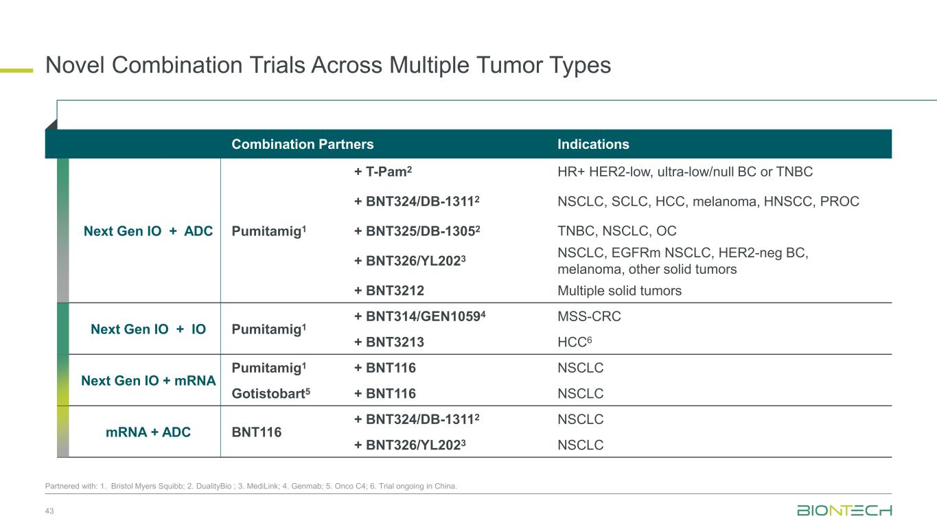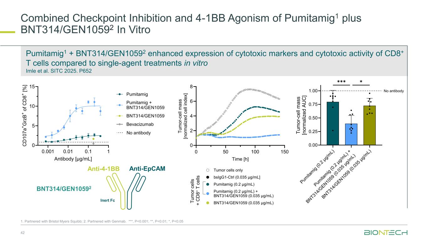 Combined Checkpoint Inhibition and 4-1BB Agonism of Pumitamig1 plus BNT314/GEN10592 In Vitro 42 1. Partnered with Bristol Myers Squibb; 2. Partnered with Genmab. ***, P<0.001; **, P<0.01; *, P<0.05 Pumitamig1 + BNT314/GEN10592 enhanced expression of cytotoxic markers and cytotoxic activity of CD8+ T cells compared to single-agent treatments in vitro Imle et al. SITC 2025. P652 T u m o r c e lls + C D 8 + T c e lls 0 50 100 150 0 2 4 6 8 Time [h] T u m o r- c e ll m a s s [n o rm a liz e d c e ll in d e x ] Atezolizumab (0.2 µg/mL) BNT314/GEN1059 (0.035 µg/mL) Pumitamig (0.2 µg/mL) + BNT314/GEN1059 (0.035 µg/mL) Pumitamig (0.2 µg/mL) bsIgG1-Ctrl (0.035 µg/mL] Tumor cells only 0.001 0.01 0.1 1 0 5 10 15 Antibody [µg/mL] C D 1 0 7 a + G rz B + o f C D 8 + [ % ] Bevacizumab BNT314/GEN1059 Pumitamig Pumitamig + BNT314/GEN1059 No antibody 0 50 0 150 0 2 4 6 8 Time [h] T u m o r- c e ll m a s s [n o rm a liz e d c e ll in d e x ] BNT314/GEN1059 (0.035 µg/mL) Pumitamig (0.2 µg/mL) + BNT314/GEN1059 (0.035 µg/mL) Pumitamig (0.2 µg/mL) bsIgG1-Ctrl (0.035 µg/mL] Tumor cells only Pum ita m ig (0 .2 µ g/ m L) Pum ita m ig (0 .2 µ g/ m L) + BN T31 4/ G E N 10 59 (0 .0 35 µ g/ m L) BN T31 4/ G E N 10 59 (0 .0 35 µ g/ m L) 0.00 0.25 0.50 0.75 1.00 T u m o r- c e ll m a s s [n o rm a liz e d A U C ] ✱✱✱✱ No antibody Anti-EpCAMAnti-4-1BB Inert Fc BNT314/GEN10592
