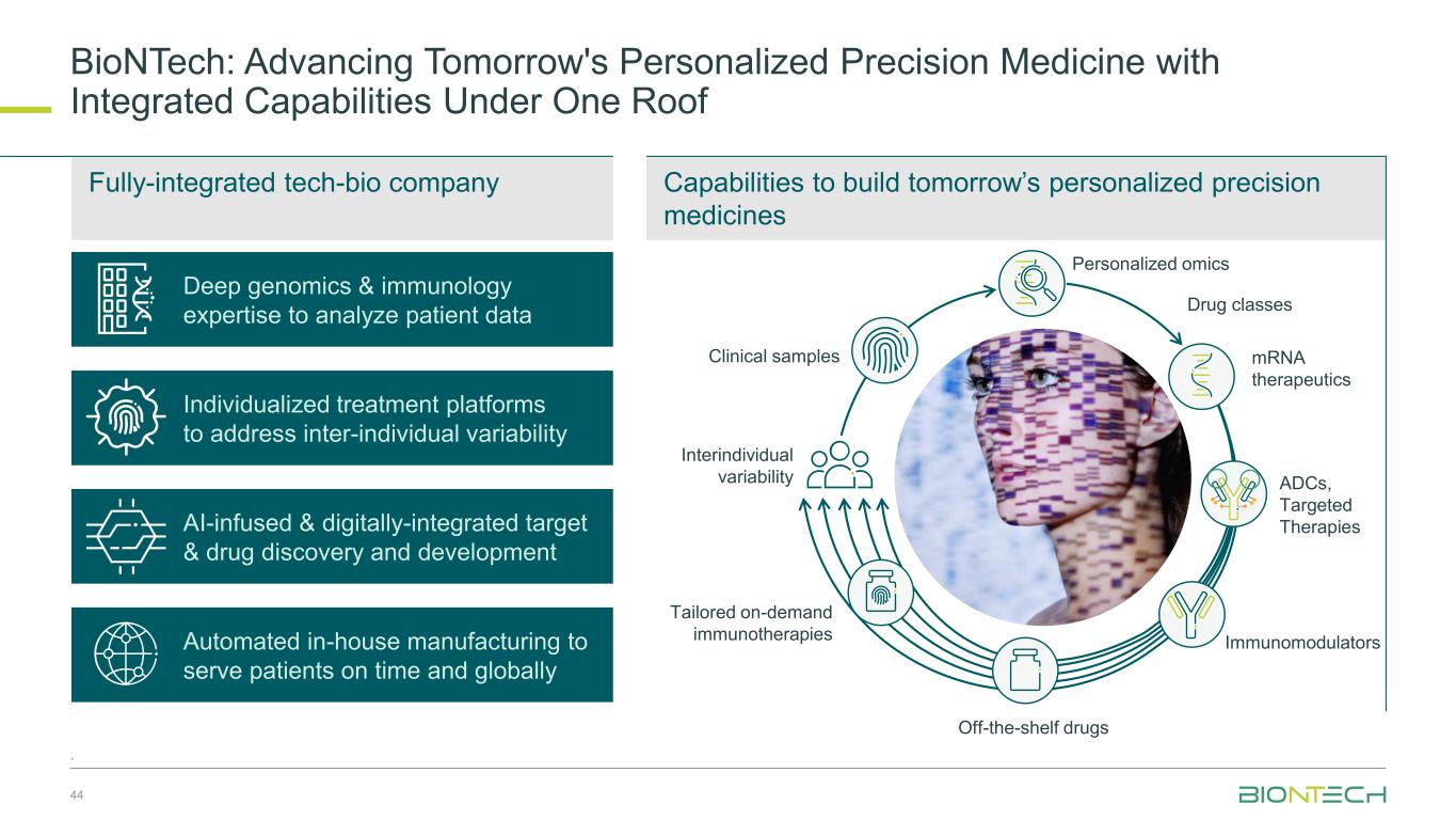 Capabilities to build tomorrow’s personalized precision medicines BioNTech: Advancing Tomorrow's Personalized Precision Medicine with Integrated Capabilities Under One Roof 44 . Automated in-house manufacturing to serve patients on time and globally Drug classes Interindividual variability Off-the-shelf drugs Tailored on-demand immunotherapies Clinical samples mRNA therapeutics Immunomodulators Personalized omics AI-infused & digitally-integrated target & drug discovery and development Individualized treatment platforms to address inter-individual variability Deep genomics & immunology expertise to analyze patient data Fully-integrated tech-bio company ADCs, Targeted Therapies f-the-shelf drugs
