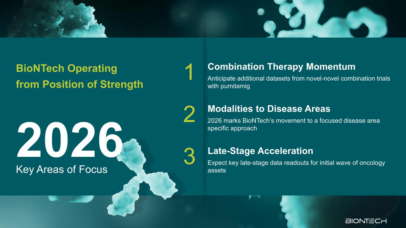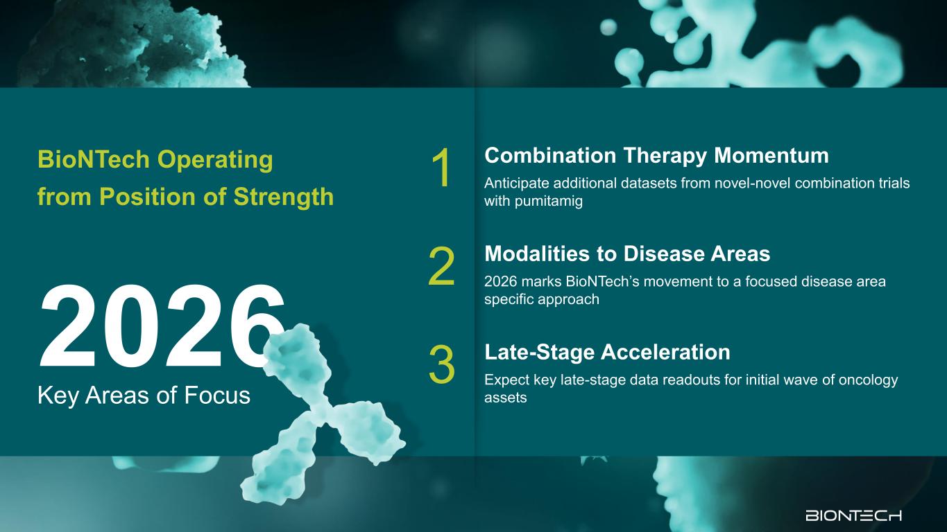Key Areas of Focus 2026 BioNTech Operating from Position of Strength 1 Combination Therapy Momentum Anticipate additional datasets from novel-novel combination trials with pumitamig 2 Modalities to Disease Areas 2026 marks BioNTech’s movement to a focused disease area specific approach 3 Late-Stage Acceleration Expect key late-stage data readouts for initial wave of oncology assets