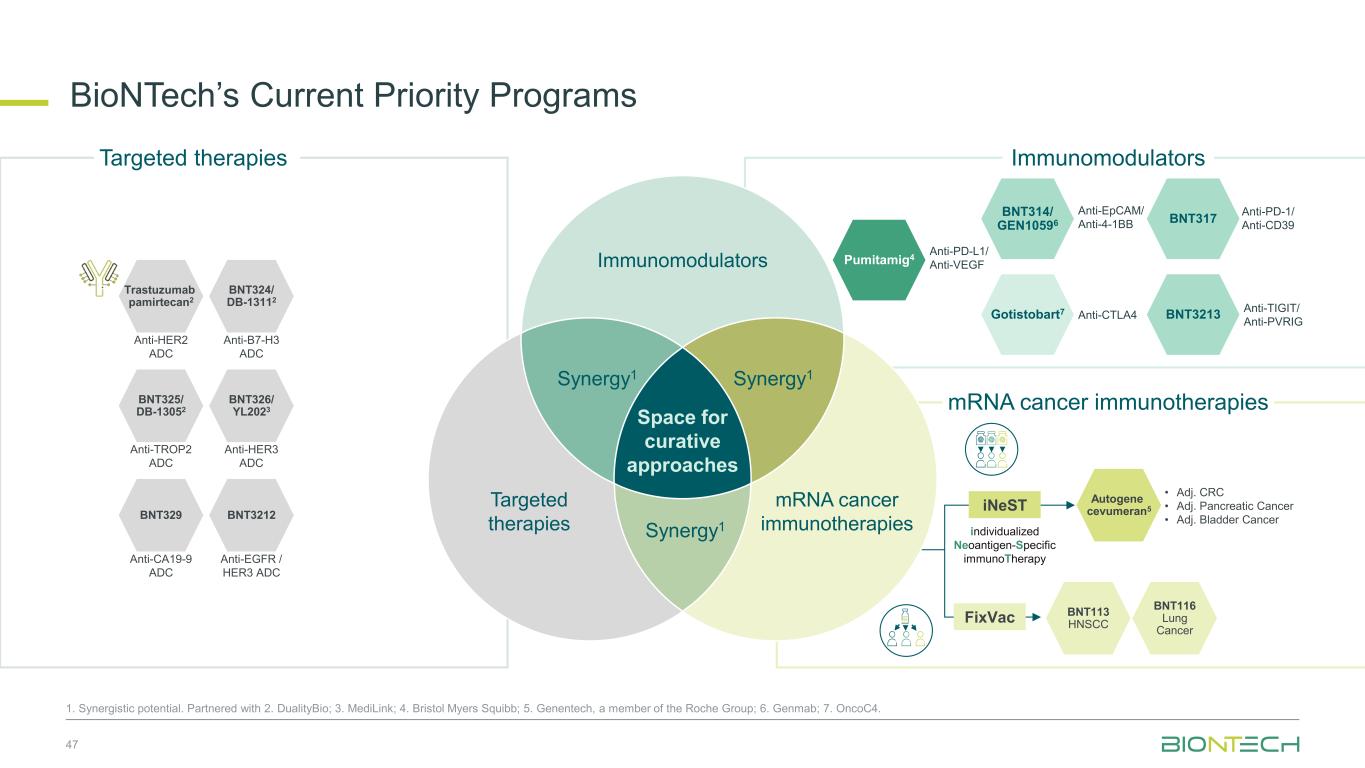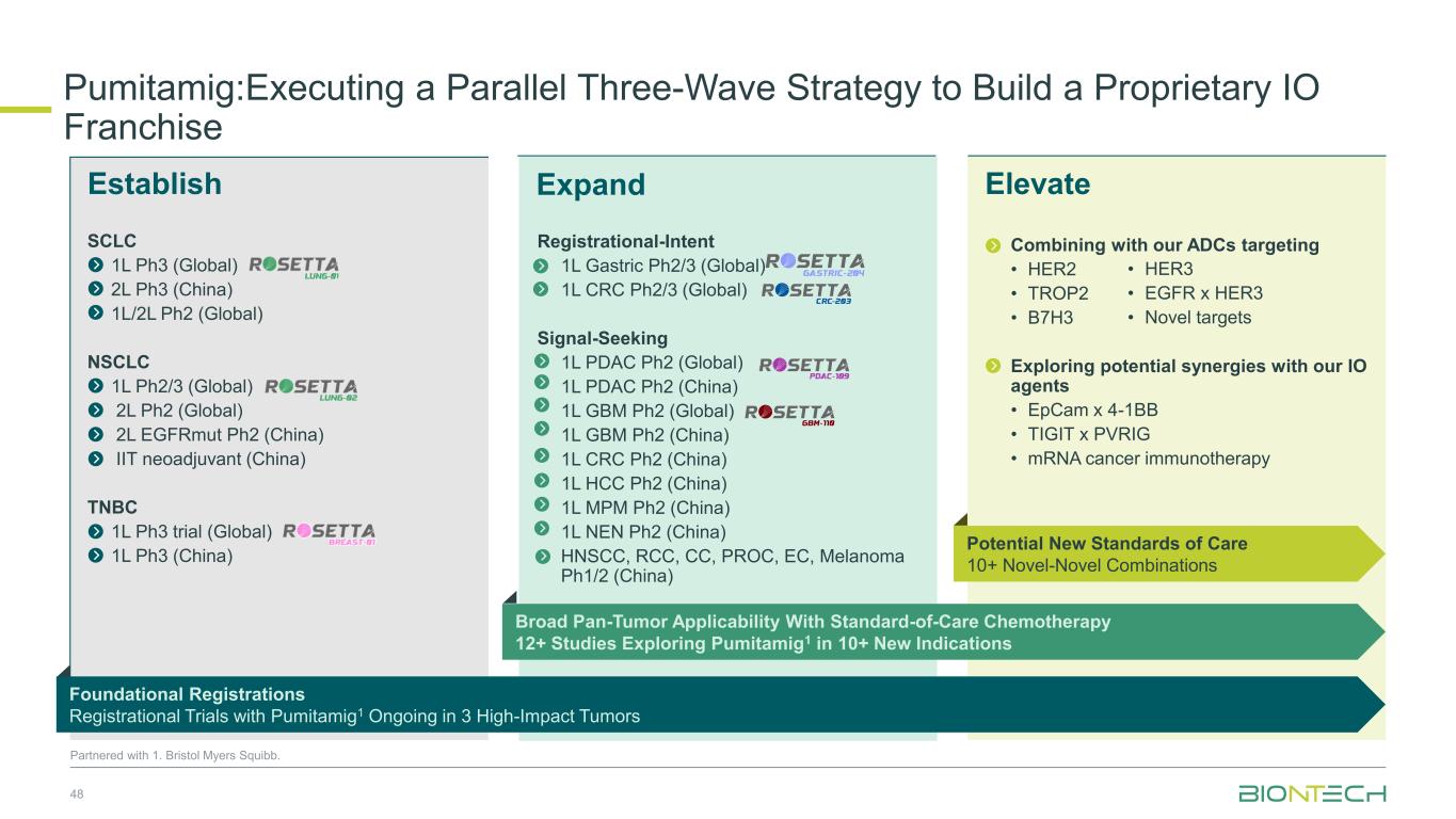 47 1. Synergistic potential. Partnered with 2. DualityBio; 3. MediLink; 4. Bristol Myers Squibb; 5. Genentech, a member of the Roche Group; 6. Genmab; 7. OncoC4. Immunomodulators mRNA cancer immunotherapies Gotistobart7 BNT314/ GEN10596 Pumitamig4 Anti-CTLA4 Anti-EpCAM/ Anti-4-1BB Anti-PD-L1/ Anti-VEGF BNT324/ DB-13112 Trastuzumab pamirtecan2 BNT325/ DB-13052 BNT326/ YL2023 Anti-HER2 ADC Anti-B7-H3 ADC Anti-TROP2 ADC Anti-HER3 ADC BNT317 BNT3213 Anti-TIGIT/ Anti-PVRIG BNT329 BNT3212 Anti-CA19-9 ADC Anti-EGFR / HER3 ADC Targeted therapies Immunomodulators Space for curative approaches Synergy1 Targeted therapies mRNA cancer immunotherapies Synergy1Synergy1 iNeST FixVac individualized Neoantigen-Specific immunoTherapy BNT113 HNSCC BNT116 Lung Cancer Autogene cevumeran5 • Adj. CRC • Adj. Pancreatic Cancer • Adj. Bladder Cancer BioNTech’s Current Priority Programs Anti-PD-1/ Anti-CD39