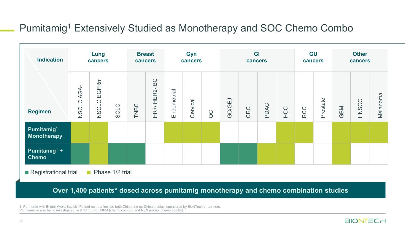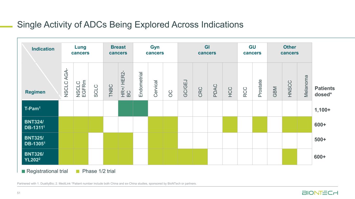Lung cancers Breast cancers Gyn cancers GI cancers GU cancers Other cancers N S C L C A G A - N S C L C E G F R m S C L C T N B C H R + / H E R 2 - B C E n d o m e tr ia l C e rv ic a l O C G C /G E J C R C P D A C H C C R C C P ro s ta te G B M H N S C C M e la n o m a Pumitamig1 Monotherapy Pumitamig1 + Chemo Regimen Pumitamig1 Extensively Studied as Monotherapy and SOC Chemo Combo 50 1. Partnered with Bristol Myers Squibb *Patient number include both China and ex-China studies, sponsored by BioNTech or partners. Pumitamig is also being investigated in BTC (mono), MPM (chemo combo), and NEN (mono, chemo combo). Over 1,400 patients* dosed across pumitamig monotherapy and chemo combination studies Indication Registrational trial Phase 1/2 trial