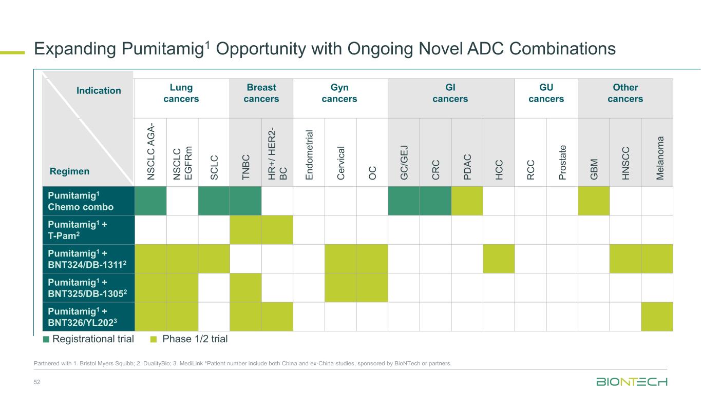 Lung cancers Breast cancers Gyn cancers GI cancers GU cancers Other cancers N S C L C A G A - N S C L C E G F R m S C L C T N B C H R + / H E R 2 - B C E n d o m e tr ia l C e rv ic a l O C G C /G E J C R C P D A C H C C R C C P ro s ta te G B M H N S C C M e la n o m a T-Pam1 BNT324/ DB-13111 BNT325/ DB-13051 BNT326/ YL2022 Regimen Single Activity of ADCs Being Explored Across Indications 51 Partnered with 1. DualityBio; 2. MediLink *Patient number include both China and ex-China studies, sponsored by BioNTech or partners. Indication Registrational trial Phase 1/2 trial 1,100+ Patients dosed* 600+ 500+ 600+