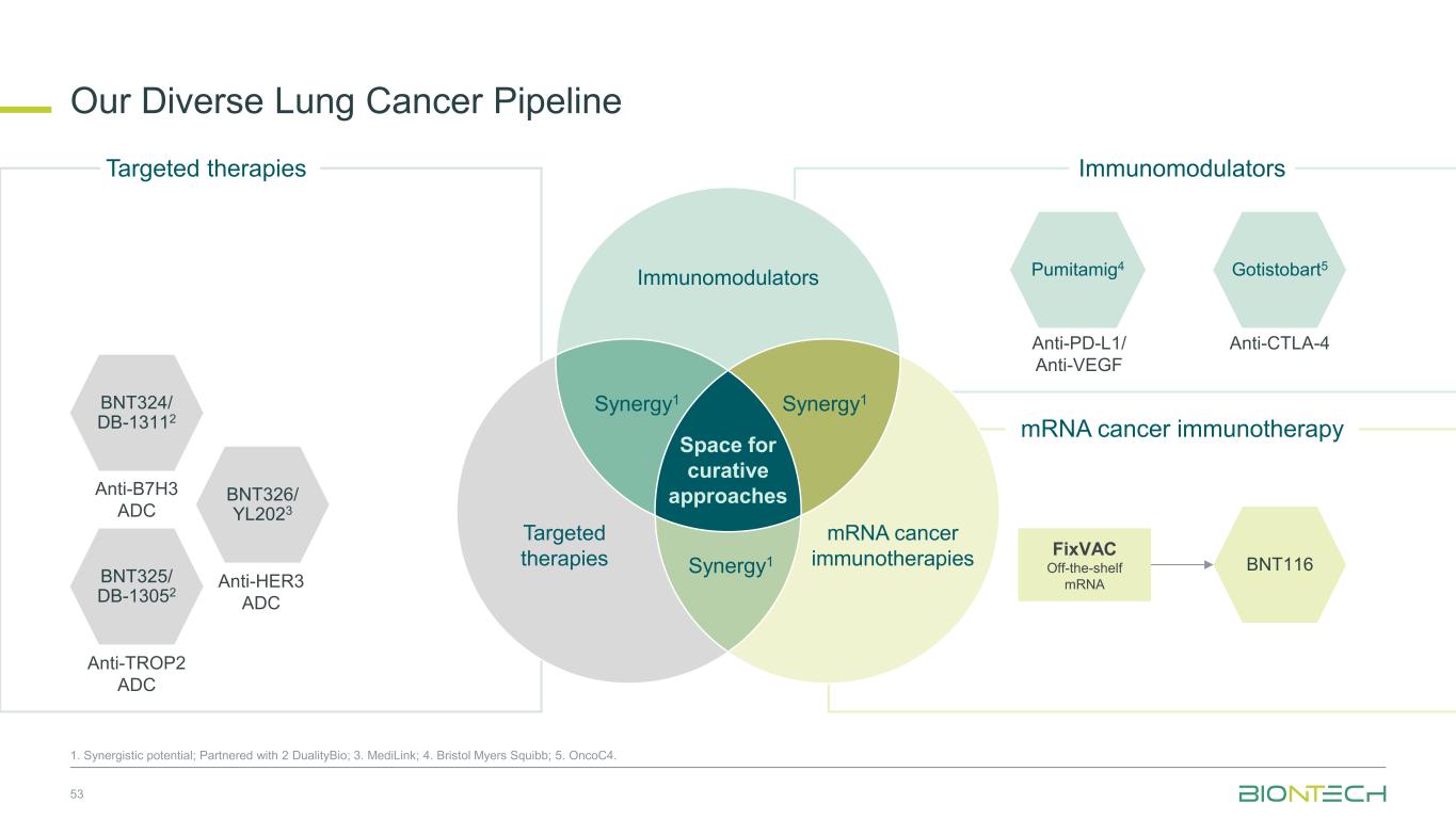Lung cancers Breast cancers Gyn cancers GI cancers GU cancers Other cancers N S C L C A G A - N S C L C E G F R m S C L C T N B C H R + / H E R 2 - B C E n d o m e tr ia l C e rv ic a l O C G C /G E J C R C P D A C H C C R C C P ro s ta te G B M H N S C C M e la n o m a Pumitamig1 Chemo combo Pumitamig1 + T-Pam2 Pumitamig1 + BNT324/DB-13112 Pumitamig1 + BNT325/DB-13052 Pumitamig1 + BNT326/YL2023 Expanding Pumitamig1 Opportunity with Ongoing Novel ADC Combinations 52 Partnered with 1. Bristol Myers Squibb; 2. DualityBio; 3. MediLink *Patient number include both China and ex-China studies, sponsored by BioNTech or partners. Regimen Indication Registrational trial Phase 1/2 trial