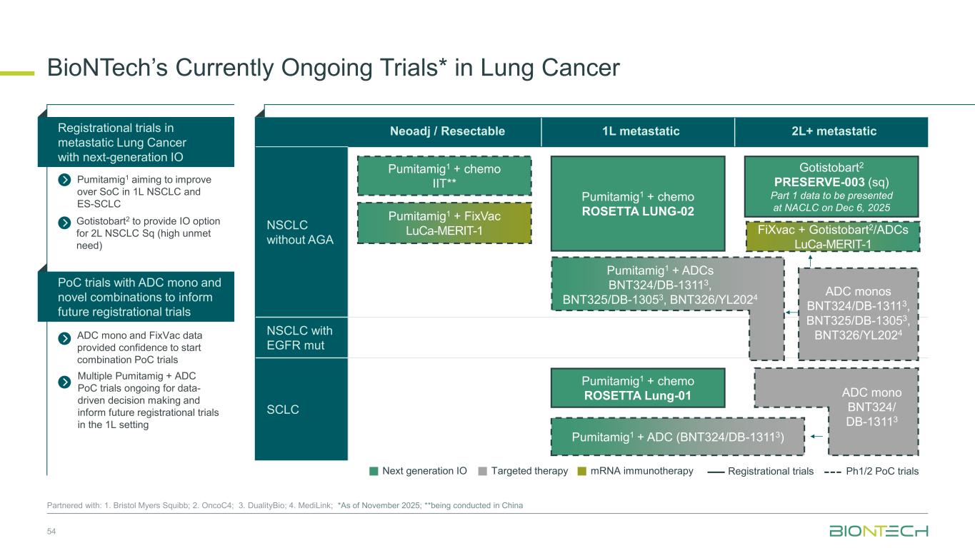 Our Diverse Lung Cancer Pipeline 53 1. Synergistic potential; Partnered with 2 DualityBio; 3. MediLink; 4. Bristol Myers Squibb; 5. OncoC4. BNT324/ DB-13112 Anti-B7H3 ADC BNT325/ DB-13052 Anti-TROP2 ADC BNT326/ YL2023 Anti-HER3 ADC Targeted therapies Immunomodulators Space for curative approaches Synergy1 Targeted therapies mRNA cancer immunotherapies Synergy1Synergy1 Anti-PD-L1/ Anti-VEGF Pumitamig4 Gotistobart5 Anti-CTLA-4 BNT116 FixVAC Off-the-shelf mRNA Immunomodulators mRNA cancer immunotherapy