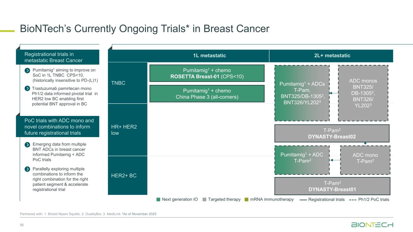 1L metastatic 2L+ metastatic TNBC HR+ HER2 low HER2+ BC BioNTech’s Currently Ongoing Trials* in Breast Cancer 56 Partnered with: 1. Bristol Myers Squibb; 2. DualityBio; 3. MediLink *As of November 2025 Pumitamig1 + chemo ROSETTA Breast-01 (CPS<10) Pumitamig1 + chemo China Phase 3 (all-comers) Emerging data from multiple BNT ADCs in breast cancer informed Pumitamig + ADC PoC trials Registrational trials in metastatic Breast Cancer Pumitamig1 aiming to improve on SoC in 1L TNBC CPS<10, (historically insensitive to PD-(L)1) PoC trials with ADC mono and novel combinations to inform future registrational trials Next generation IO Targeted therapy mRNA immunotherapy Registrational trials Ph1/2 PoC trials T-Pam2 DYNASTY-Breast02 ADC monos BNT325/ DB-13052, BNT326/ YL2023 ADC mono T-Pam2 Pumitamig1 + ADCs T-Pam, BNT325/DB-13052, BNT326/YL2023 Pumitamig1 + ADC T-Pam2 Trastuzumab pamirtecan mono Ph1/2 data informed pivotal trial in HER2 low BC enabling first potential BNT approval in BC Parallelly exploring multiple combinations to inform the right combination for the right patient segment & accelerate registrational trial T-Pam2 DYNASTY-Breast01
