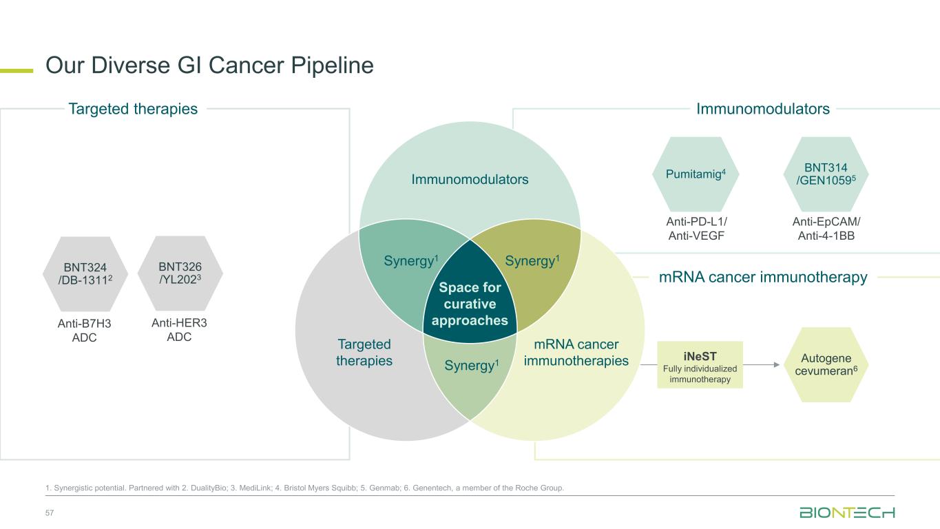 Anti-PD-L1/ Anti-VEGF Pumitamig4 Autogene cevumeran6 Immunomodulators mRNA cancer immunotherapy Our Diverse GI Cancer Pipeline 57 1. Synergistic potential. Partnered with 2. DualityBio; 3. MediLink; 4. Bristol Myers Squibb; 5. Genmab; 6. Genentech, a member of the Roche Group. Targeted therapies iNeST Fully individualized immunotherapy BNT314 /GEN10595 Anti-EpCAM/ Anti-4-1BB BNT326 /YL2023 Anti-HER3 ADC BNT324 /DB-13112 Anti-B7H3 ADC Immunomodulators Space for curative approaches Synergy1 Targeted therapies mRNA cancer immunotherapies Synergy1Synergy1