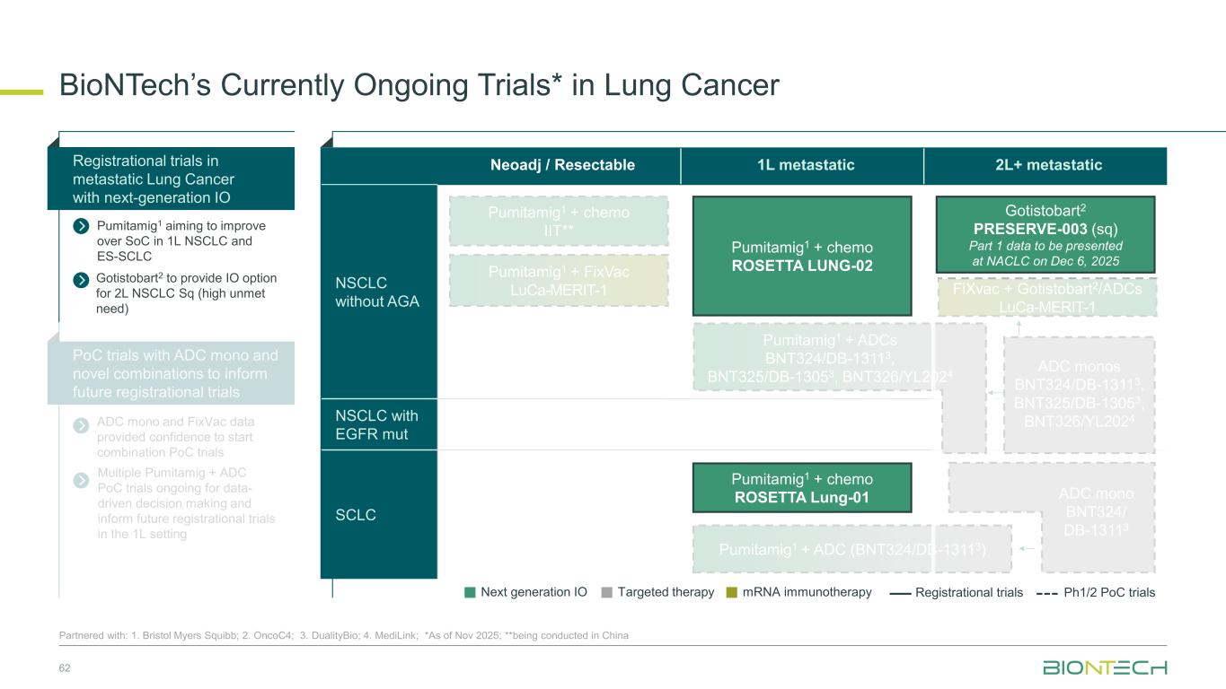 Our Diverse Lung Cancer Pipeline 61 1. Synergistic potential; Partnered with 2 DualityBio; 3. MediLink; 4. Bristol Myers Squibb; 5. OncoC4. BNT324/ DB-13112 Anti-B7H3 ADC BNT325/ DB-13052 Anti-TROP2 ADC BNT326/ YL2023 Anti-HER3 ADC Targeted therapies Immunomodulators Space for curative approaches Synergy1 Targeted therapies mRNA cancer immunotherapies Synergy1Synergy1 Anti-PD-L1/ Anti-VEGF Pumitamig4 Gotistobart5 Anti-CTLA-4 BNT116 FixVAC Off-the-shelf mRNA Immunomodulators mRNA cancer immunotherapy
