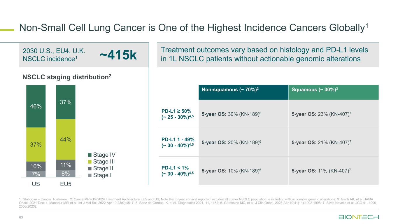Neoadj / Resectable 1L metastatic 2L+ metastatic NSCLC without AGA NSCLC with EGFR mut SCLC BioNTech’s Currently Ongoing Trials* in Lung Cancer 62 Partnered with: 1. Bristol Myers Squibb; 2. OncoC4; 3. DualityBio; 4. MediLink; *As of Nov 2025; **being conducted in China ADC mono and FixVac data provided confidence to start combination PoC trials Registrational trials in metastatic Lung Cancer with next-generation IO Pumitamig1 aiming to improve over SoC in 1L NSCLC and ES-SCLC PoC trials with ADC mono and novel combinations to inform future registrational trials Next generation IO Targeted therapy mRNA immunotherapy Registrational trials Ph1/2 PoC trials Gotistobart2 PRESERVE-003 (sq) Part 1 data to be presented at NACLC on Dec 6, 2025 FiXvac + Gotistobart2/ADCs LuCa-MERIT-1 Pumitamig1 + chemo ROSETTA Lung-01 Pumitamig1 + chemo IIT** Pumitamig1 + chemo ROSETTA LUNG-02 ADC monos BNT324/DB-13113, BNT325/DB-13053, BNT326/YL2024 Pumitamig1 + FixVac LuCa-MERIT-1 Pumitamig1 + ADCs BNT324/DB-13113, BNT325/DB-13053, BNT326/YL2024 ADC mono BNT324/ DB-13113 Pumitamig1 + ADC (BNT324/DB-13113) Gotistobart2 to provide IO option for 2L NSCLC Sq (high unmet need) Multiple Pumitamig + ADC PoC trials ongoing for data- driven decision making and inform future registrational trials in the 1L setting