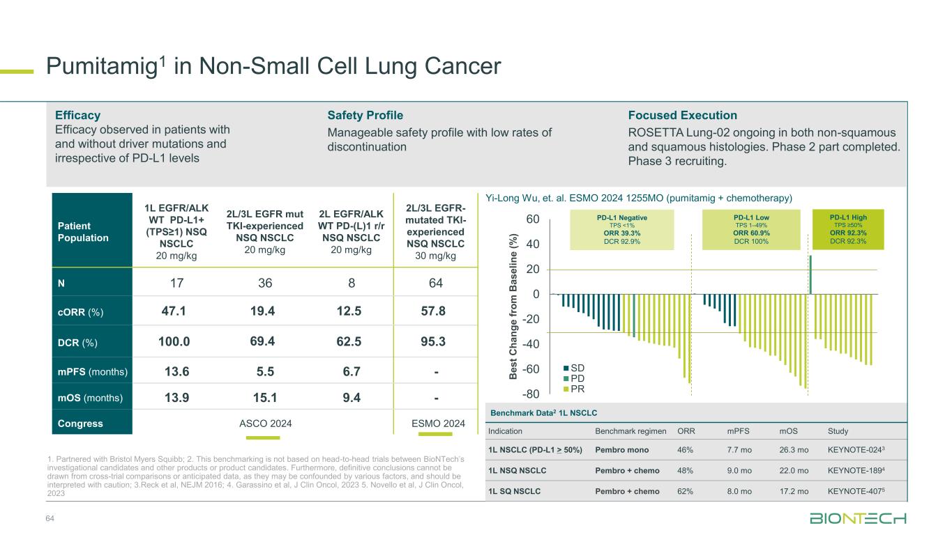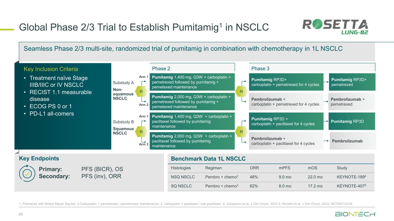 64 Patient Population 1L EGFR/ALK WT PD-L1+ (TPS≥1) NSQ NSCLC 20 mg/kg 2L/3L EGFR mut TKI-experienced NSQ NSCLC 20 mg/kg 2L EGFR/ALK WT PD-(L)1 r/r NSQ NSCLC 20 mg/kg 2L/3L EGFR- mutated TKI- experienced NSQ NSCLC 30 mg/kg N 17 36 8 64 cORR (%) 47.1 19.4 12.5 57.8 DCR (%) 100.0 69.4 62.5 95.3 mPFS (months) 13.6 5.5 6.7 - mOS (months) 13.9 15.1 9.4 - Congress ASCO 2024 ESMO 2024 Efficacy Efficacy observed in patients with and without driver mutations and irrespective of PD-L1 levels Safety Profile Manageable safety profile with low rates of discontinuation Focused Execution ROSETTA Lung-02 ongoing in both non-squamous and squamous histologies. Phase 2 part completed. Phase 3 recruiting. Pumitamig1 in Non-Small Cell Lung Cancer 1. Partnered with Bristol Myers Squibb; 2. This benchmarking is not based on head-to-head trials between BioNTech’s investigational candidates and other products or product candidates. Furthermore, definitive conclusions cannot be drawn from cross-trial comparisons or anticipated data, as they may be confounded by various factors, and should be interpreted with caution; 3.Reck et al, NEJM 2016; 4. Garassino et al, J Clin Oncol, 2023 5. Novello et al, J Clin Oncol, 2023 -80 -60 -40 -20 0 20 40 60 SD PD PR B e s t C h a n g e f ro m B a s e li n e ( % ) PD-L1 Negative TPS <1% ORR 39.3% DCR 92.9% PD-L1 High TPS ≥50% ORR 92.3% DCR 92.3% PD-L1 Low TPS 1–49% ORR 60.9% DCR 100% Yi-Long Wu, et. al. ESMO 2024 1255MO (pumitamig + chemotherapy) Benchmark Data2 1L NSCLC Indication Benchmark regimen ORR mPFS mOS Study 1L NSCLC (PD-L1 > 50%) Pembro mono 46% 7.7 mo 26.3 mo KEYNOTE-0243 1L NSQ NSCLC Pembro + chemo 48% 9.0 mo 22.0 mo KEYNOTE-1894 1L SQ NSCLC Pembro + chemo 62% 8.0 mo 17.2 mo KEYNOTE-4075