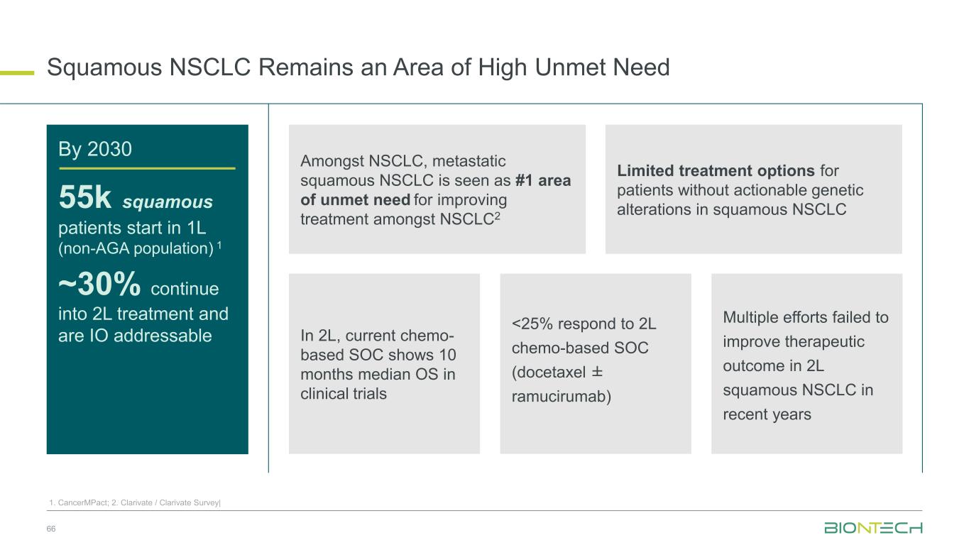 Seamless Phase 2/3 multi-site, randomized trial of pumitamig in combination with chemotherapy in 1L NSCLC Benchmark Data 1L NSCLC Histologies Regimen ORR mPFS mOS Study NSQ NSCLC Pembro + chemo2 48% 9.0 mo 22.0 mo KEYNOTE-1894 SQ NSCLC Pembro + chemo3 62% 8.0 mo 17.2 mo KEYNOTE-4075 Global Phase 2/3 Trial to Establish Pumitamig1 in NSCLC 65 1. Partnered with Bristol Meyer Squibb; 2.Carboplatin + pemetrexed→pemetrexed maintenance. 3. carboplatin + paclitaxel / nab-paclitaxel. 4. Garassino et al, J Clin Oncol, 2023 5. Novello et al, J Clin Oncol, 2023; NCT06712316. Key Endpoints Key Inclusion Criteria • Treatment naïve Stage IIIB/IIIC or IV NSCLC • RECIST 1.1 measurable disease • ECOG PS 0 or 1 • PD-L1 all-comers Primary: PFS (BICR), OS Secondary: PFS (inv), ORR Phase 2 Phase 3 Pumitamig 2,000 mg, Q3W + carboplatin + pemetrexed followed by pumitamig + pemetexed maintenance Arm 1 Arm 2 Pumitamig RP3D+ pemetrexed Pembrolizumab + pemetrexed Pumitamig RP3D Pembrolizumab Pumitamig RP3D+ carboplatin + pemetrexed for 4 cycles Pembrolizumab + carboplatin + pemetrexed for 4 cycles Pumitamig RP3D + carboplatin + paclitaxel for 4 cycles Pembrolizumab + carboplatin + paclitaxel for 4 cycles Pumitamig 1,400 mg, Q3W + carboplatin + pemetrexed followed by pumitamig + pemetexed maintenance Pumitamig 1,400 mg, Q3W + carboplatin + paclitaxel followed by pumitamig maintenance Pumitamig 2,000 mg, Q3W + carboplatin + paclitaxel followed by pumitamig maintenance Substudy A Non- squamous NSCLC Substudy B Squamous NSCLC R R R Arm 1 Arm 2 R