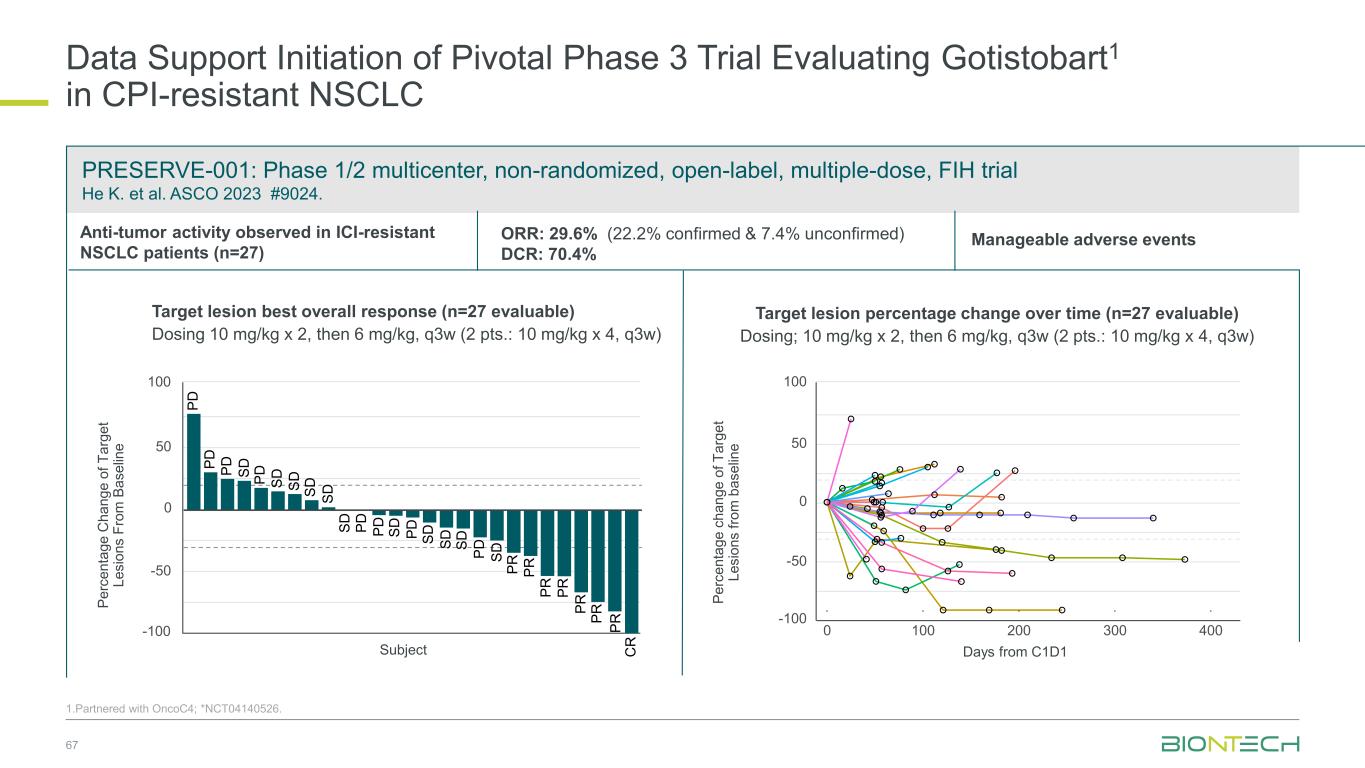 PRESERVE-001: Phase 1/2 multicenter, non-randomized, open-label, multiple-dose, FIH trial He K. et al. ASCO 2023 #9024. Data Support Initiation of Pivotal Phase 3 Trial Evaluating Gotistobart1 in CPI-resistant NSCLC 67 Target lesion best overall response (n=27 evaluable) Dosing 10 mg/kg x 2, then 6 mg/kg, q3w (2 pts.: 10 mg/kg x 4, q3w) Target lesion percentage change over time (n=27 evaluable) Dosing; 10 mg/kg x 2, then 6 mg/kg, q3w (2 pts.: 10 mg/kg x 4, q3w) Days from C1D1 -100 -50 0 50 100 0 100 200 300 400 P e rc e n ta g e c h a n g e o f T a rg e t L e s io n s fr o m b a s e lin e Anti-tumor activity observed in ICI-resistant NSCLC patients (n=27) -100 -50 0 50 100 S D S D S D S D C R P R P R P D P D S D P R P D P D S D P D S DP D P R S D S D S D S D P R P D P RP R P D Subject P e rc e n ta g e C h a n g e o f T a rg e t L e s io n s F ro m B a s e lin e Manageable adverse eventsORR: 29.6% (22.2% confirmed & 7.4% unconfirmed) DCR: 70.4% Phase 3 trial in NSCLC ongoing 1.Partnered with OncoC4; *NCT04140526.