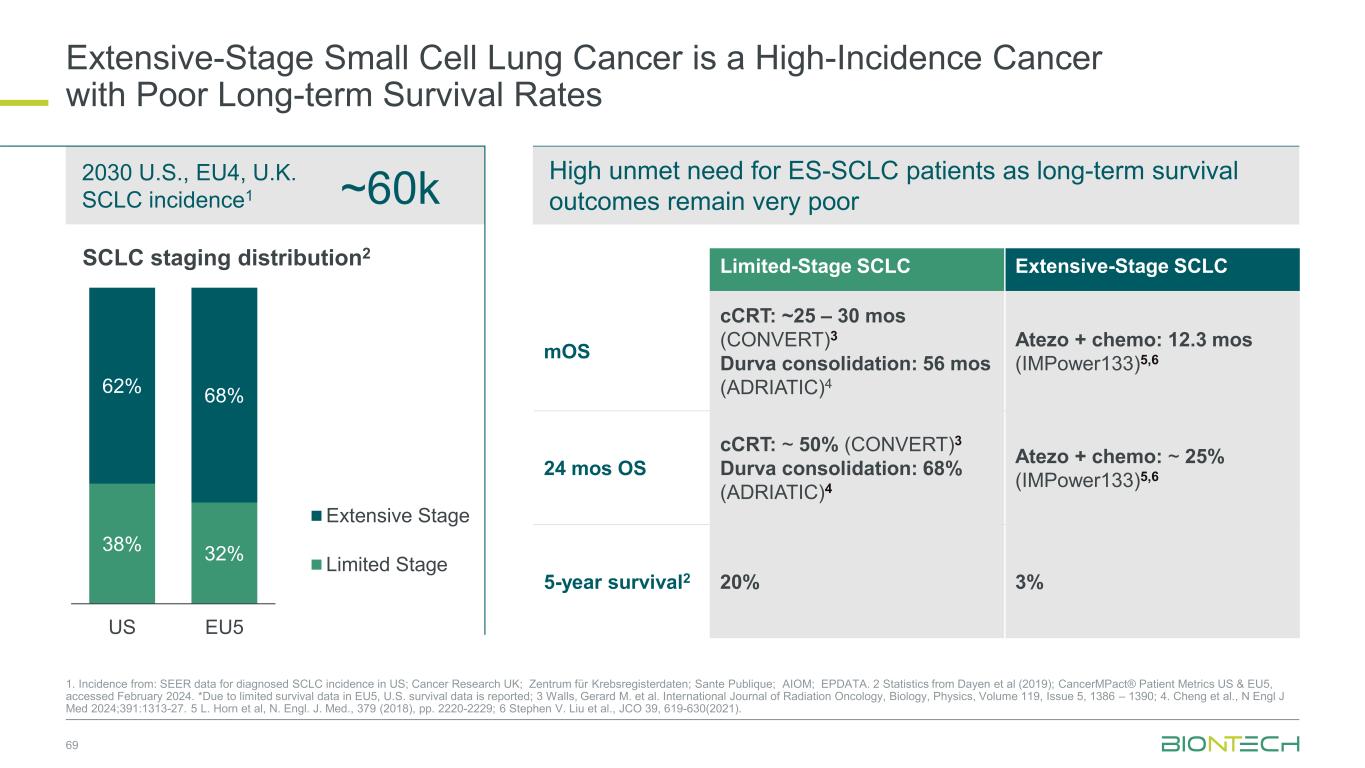 69 ~60k 2030 U.S., EU4, U.K. SCLC incidence1 1. Incidence from: SEER data for diagnosed SCLC incidence in US; Cancer Research UK; Zentrum für Krebsregisterdaten; Sante Publique; AIOM; EPDATA. 2 Statistics from Dayen et al (2019); CancerMPact® Patient Metrics US & EU5, accessed February 2024. *Due to limited survival data in EU5, U.S. survival data is reported; 3 Walls, Gerard M. et al. International Journal of Radiation Oncology, Biology, Physics, Volume 119, Issue 5, 1386 – 1390; 4. Cheng et al., N Engl J Med 2024;391:1313-27. 5 L. Horn et al, N. Engl. J. Med., 379 (2018), pp. 2220-2229; 6 Stephen V. Liu et al., JCO 39, 619-630(2021). Extensive-Stage Small Cell Lung Cancer is a High-Incidence Cancer with Poor Long-term Survival Rates 38% 32% 62% 68% US EU5 Extensive Stage Limited Stage SCLC staging distribution2 Limited-Stage SCLC Extensive-Stage SCLC mOS cCRT: ~25 – 30 mos (CONVERT)3 Durva consolidation: 56 mos (ADRIATIC)4 Atezo + chemo: 12.3 mos (IMPower133)5,6 24 mos OS cCRT: ~ 50% (CONVERT)3 Durva consolidation: 68% (ADRIATIC)4 Atezo + chemo: ~ 25% (IMPower133)5,6 5-year survival2 20% 3% High unmet need for ES-SCLC patients as long-term survival outcomes remain very poor