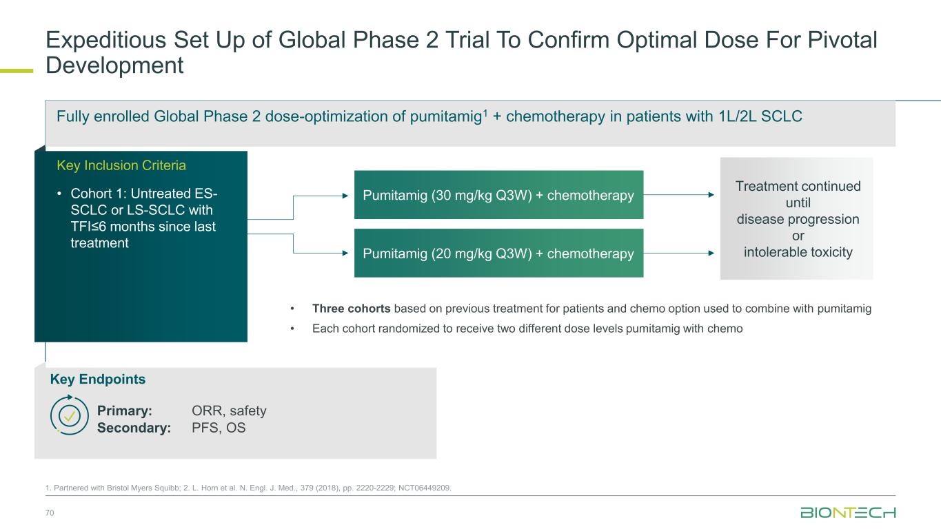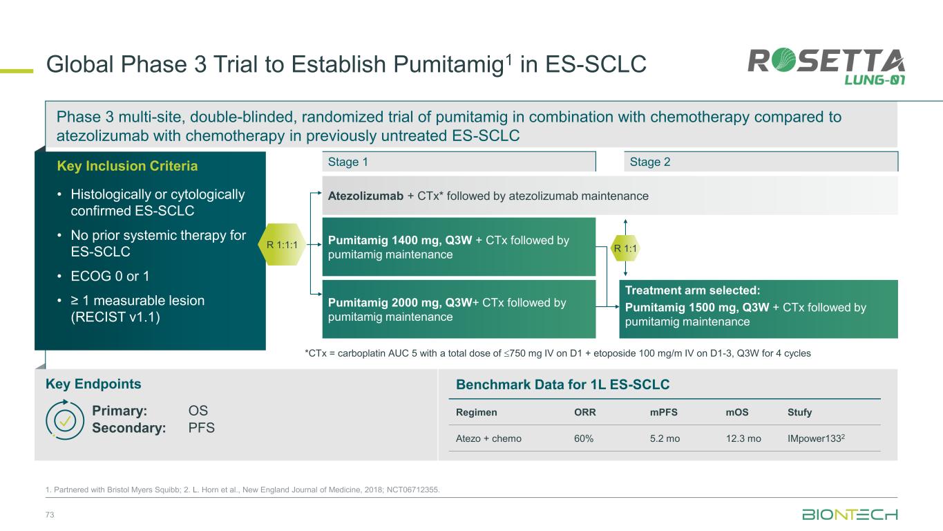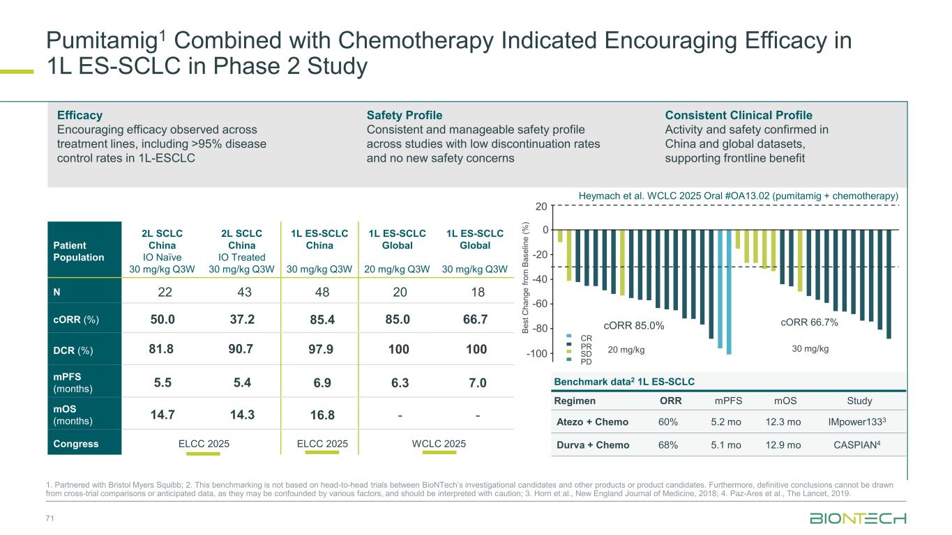 71 cORR 66.7%cORR 85.0% 20 0 -20 -40 -60 -80 -100 30 mg/kg20 mg/kg B e s t C h a n g e f ro m B a s e lin e ( % ) PD SD PR CR Patient Population 2L SCLC China IO Naïve 30 mg/kg Q3W 2L SCLC China IO Treated 30 mg/kg Q3W 1L ES-SCLC China 30 mg/kg Q3W 1L ES-SCLC Global 20 mg/kg Q3W 1L ES-SCLC Global 30 mg/kg Q3W N 22 43 48 20 18 cORR (%) 50.0 37.2 85.4 85.0 66.7 DCR (%) 81.8 90.7 97.9 100 100 mPFS (months) 5.5 5.4 6.9 6.3 7.0 mOS (months) 14.7 14.3 16.8 - - Congress ELCC 2025 ELCC 2025 WCLC 2025 Efficacy Encouraging efficacy observed across treatment lines, including >95% disease control rates in 1L-ESCLC Safety Profile Consistent and manageable safety profile across studies with low discontinuation rates and no new safety concerns Consistent Clinical Profile Activity and safety confirmed in China and global datasets, supporting frontline benefit Heymach et al. WCLC 2025 Oral #OA13.02 (pumitamig + chemotherapy) Pumitamig1 Combined with Chemotherapy Indicated Encouraging Efficacy in 1L ES-SCLC in Phase 2 Study 1. Partnered with Bristol Myers Squibb; 2. This benchmarking is not based on head-to-head trials between BioNTech’s investigational candidates and other products or product candidates. Furthermore, definitive conclusions cannot be drawn from cross-trial comparisons or anticipated data, as they may be confounded by various factors, and should be interpreted with caution; 3. Horn et al., New England Journal of Medicine, 2018; 4. Paz-Ares et al., The Lancet, 2019. Benchmark data2 1L ES-SCLC Regimen ORR mPFS mOS Study Atezo + Chemo 60% 5.2 mo 12.3 mo IMpower1333 Durva + Chemo 68% 5.1 mo 12.9 mo CASPIAN4