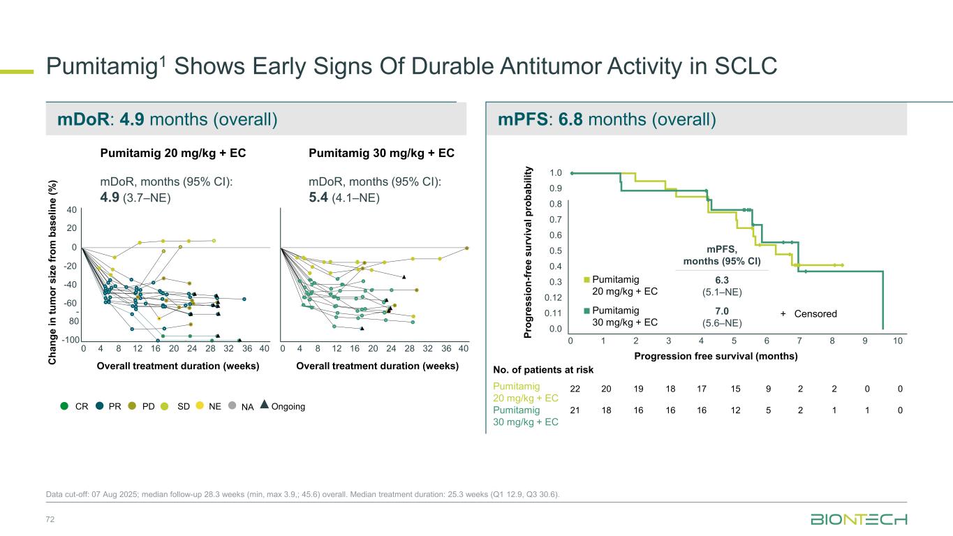 mDoR: 4.9 months (overall) mPFS: 6.8 months (overall) Pumitamig1 Shows Early Signs Of Durable Antitumor Activity in SCLC Data cut-off: 07 Aug 2025; median follow-up 28.3 weeks (min, max 3.9,; 45.6) overall. Median treatment duration: 25.3 weeks (Q1 12.9, Q3 30.6). Overall treatment duration (weeks) Overall treatment duration (weeks)C h a n g e i n t u m o r s iz e f ro m b a s e li n e ( % ) PDPRCR SD NE OngoingNA Pumitamig 20 mg/kg + EC mDoR, months (95% CI): 4.9 (3.7–NE) Pumitamig 30 mg/kg + EC mDoR, months (95% CI): 5.4 (4.1–NE) mPFS, months (95% CI) Pumitamig 20 mg/kg + EC 6.3 (5.1–NE) Pumitamig 30 mg/kg + EC 7.0 (5.6–NE) P ro g re s s io n -f re e s u rv iv a l p ro b a b il it y + Censored Progression free survival (months) Pumitamig 20 mg/kg + EC Pumitamig 30 mg/kg + EC No. of patients at risk 22 21 20 18 19 16 18 16 17 16 15 12 9 5 2 2 2 1 0 1 0 0 40 20 0 -20 -40 -60 - 80 -100 0 4 8 12 16 20 24 28 32 36 40 0 4 8 12 16 20 24 28 32 36 40 0 1 2 3 4 0.0 0.11 0.12 0.3 0.4 0.5 0.6 0.7 0.8 0.9 1.0 5 6 7 8 9 10 72
